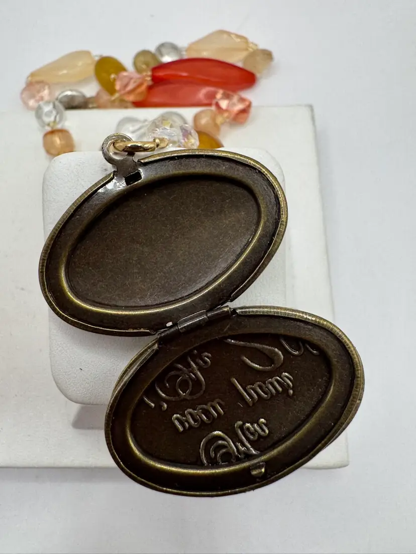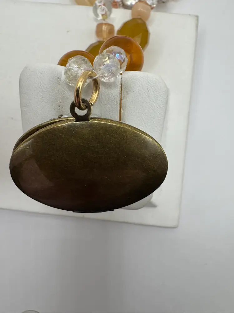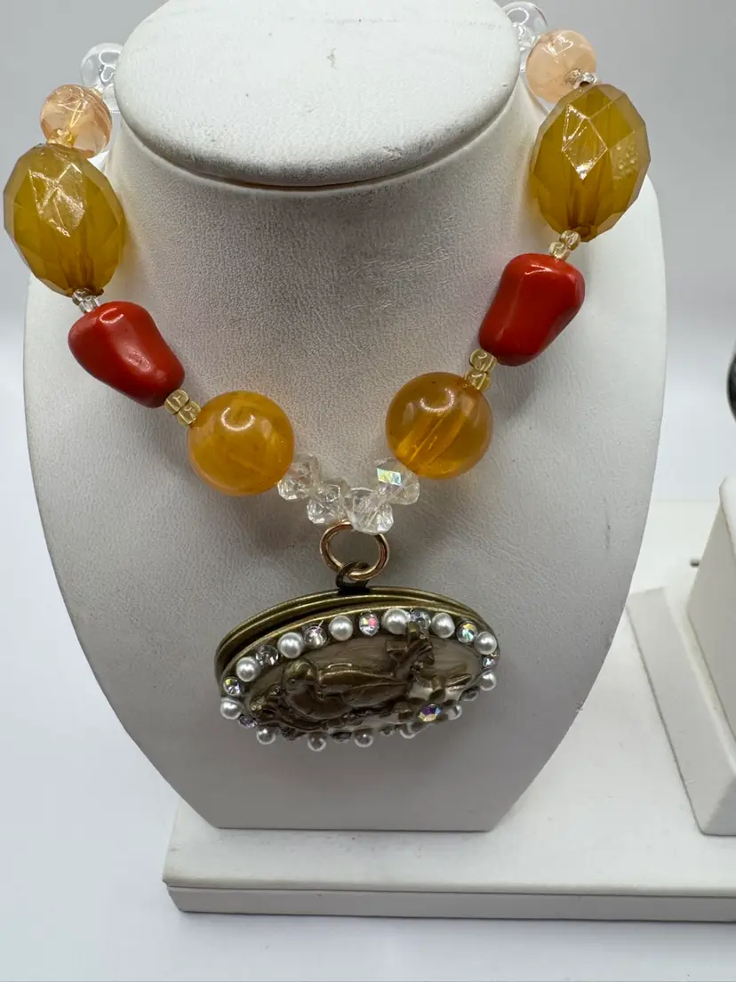 Vtg locket with love birds, border of little pearl and rhinestone embellishments. Added to beaded 16 inch necklace as shown