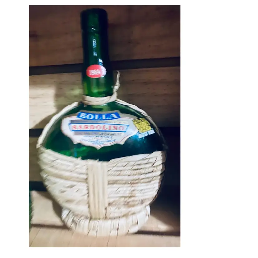 This item is a vintage 1969 Bolla Bardolino Italian wine bottle, specifically a "fiasco" style bottle wrapped in wicker or rattan. Origin: Produced in Verona, Italy. Material: Green glass encased in a woven straw basket. Purpose: Often collected as a decorative item or for display.