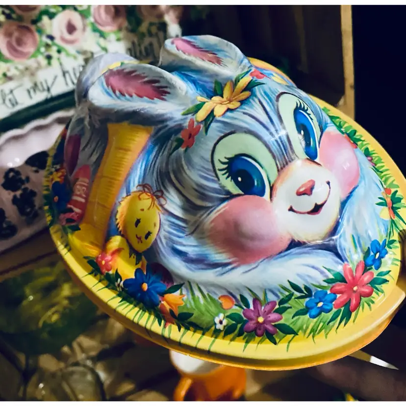 This vintage Ullman Company Easter bunny candy container is a colorful, 3D molded plastic decorative box from the 1980s.