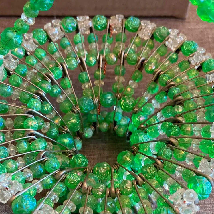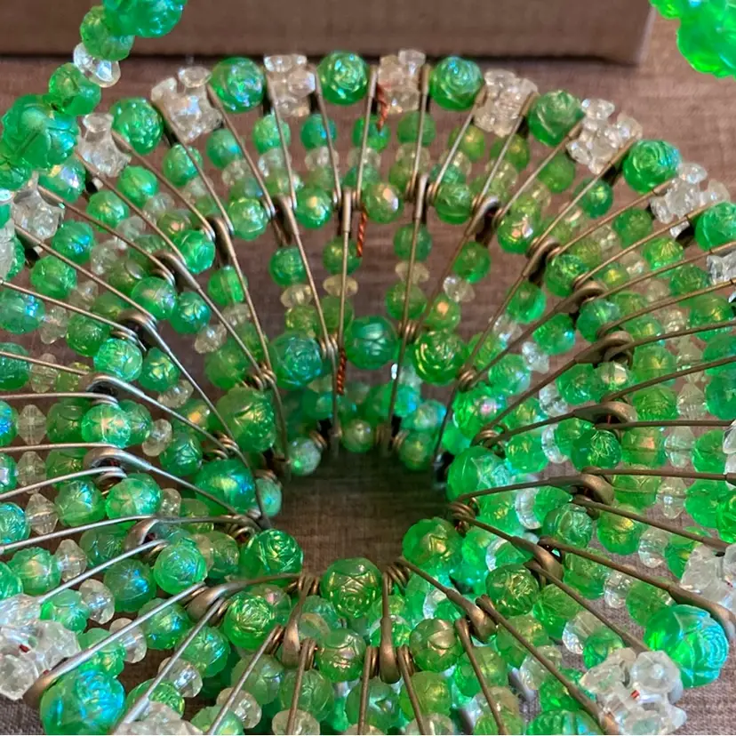 Mid-century modern beaded basket made a safety pins and green and clear beads. Good condition no breakage.