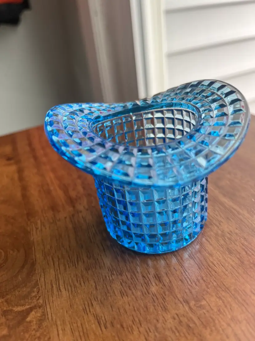 This particular top hat-shaped toothpick holder is an example of the company's output during its early years. The "Squares" pattern, also known as "Tapered Block" or "No. 1353 Hat," is characteristic of the pressed glass techniques popular at the turn of the century. These small, decorative glass items were common household accessories and are now appreciated for their craftsmanship and historical significance.