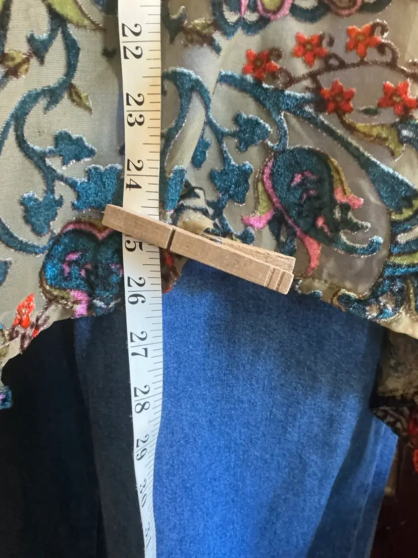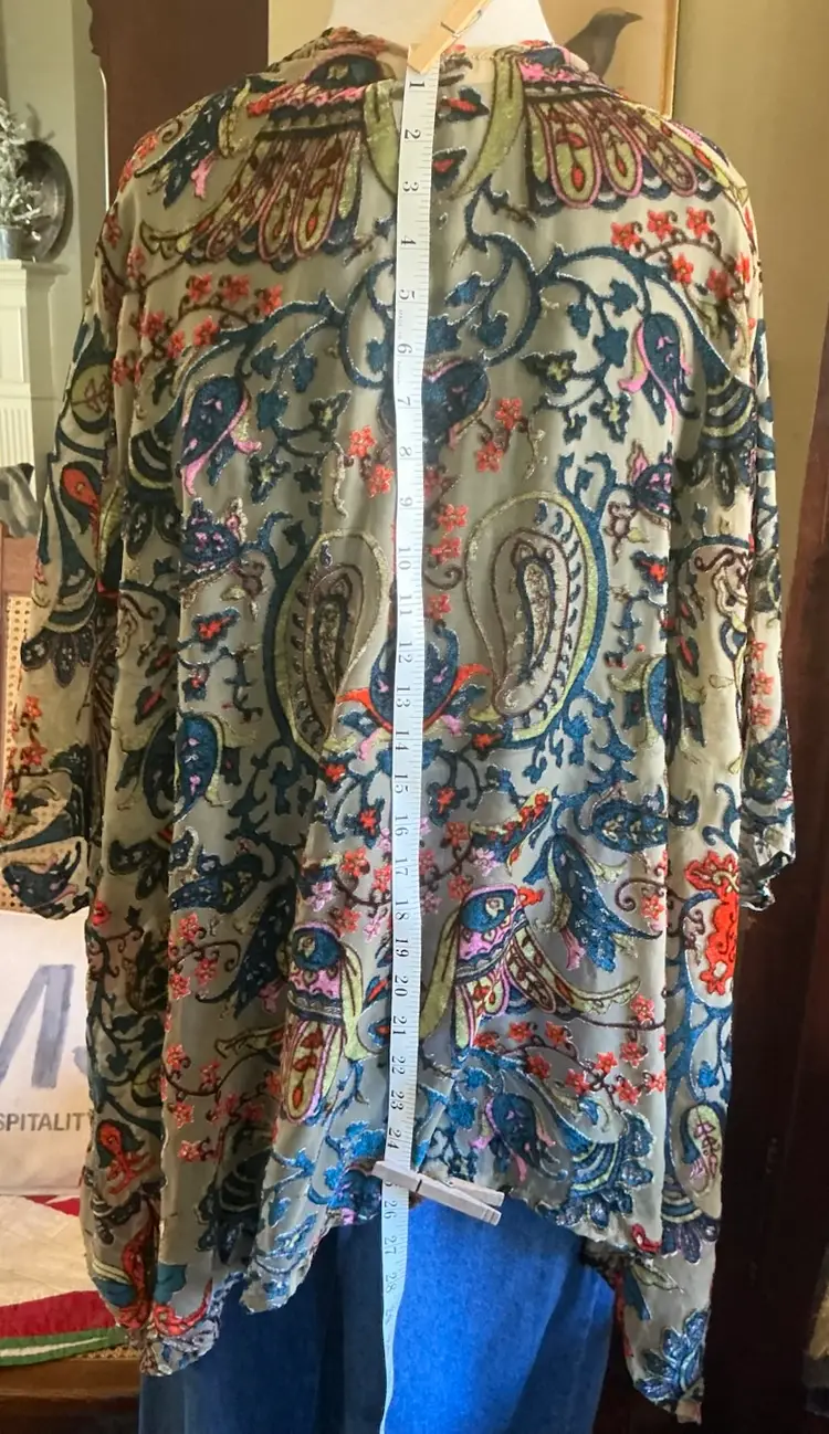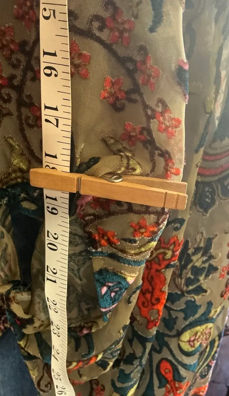 Dimensions: 36” Length on Sides 26” Length at Base of Center Back 19” Length of Sleeve at Top 23” Length of Sleeve at Bottom Chest 40: width from arm pit to arm pit