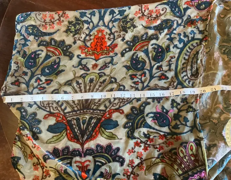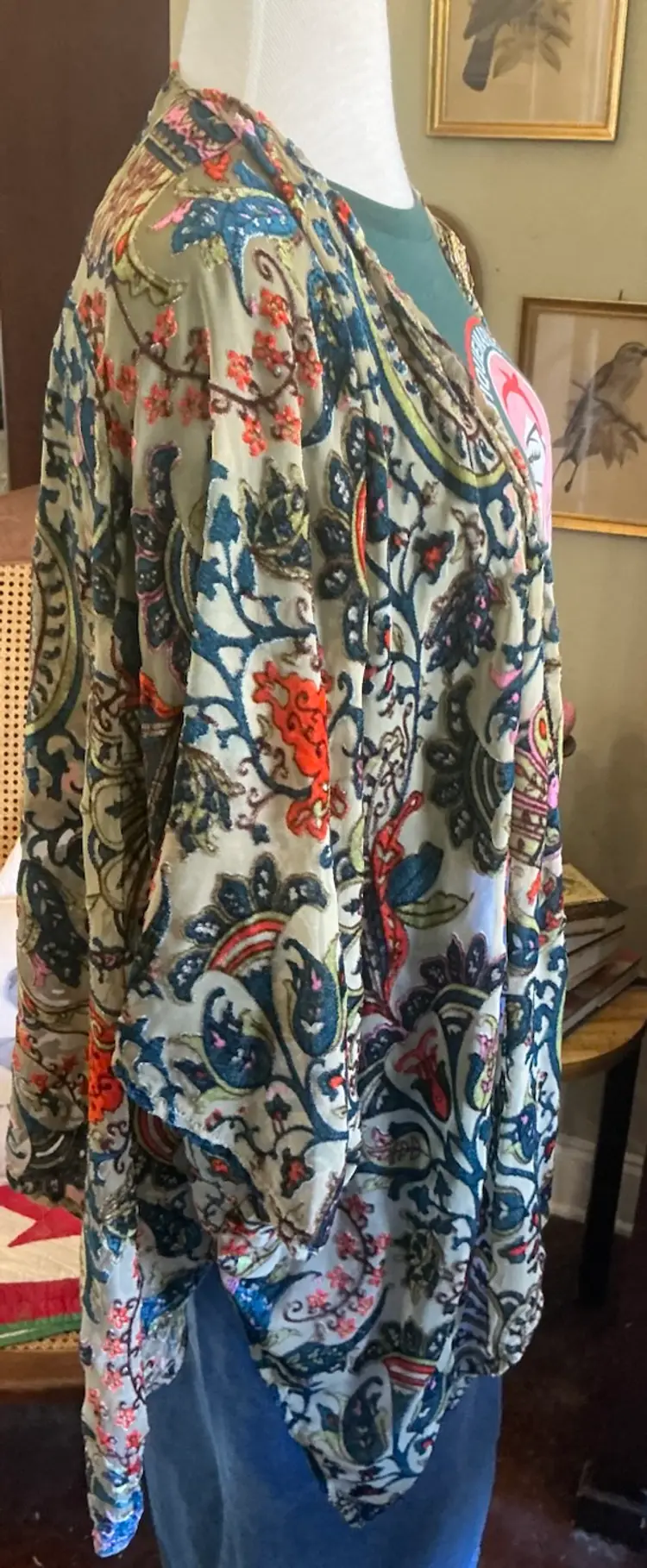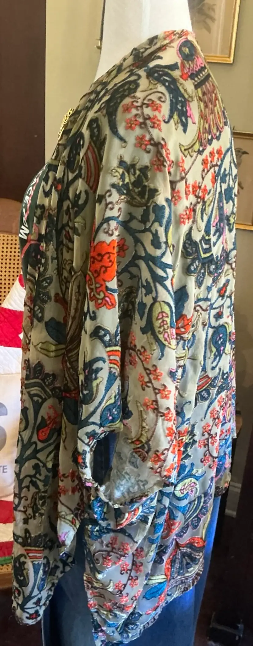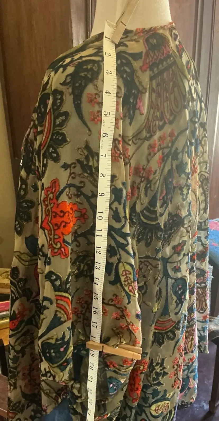 Dimensions: 36” Length on Sides 26” Length at Base of Center Back 19” Length of Sleeve at Top 23” Length of Sleeve at Bottom Chest 40: width from arm pit to arm pit