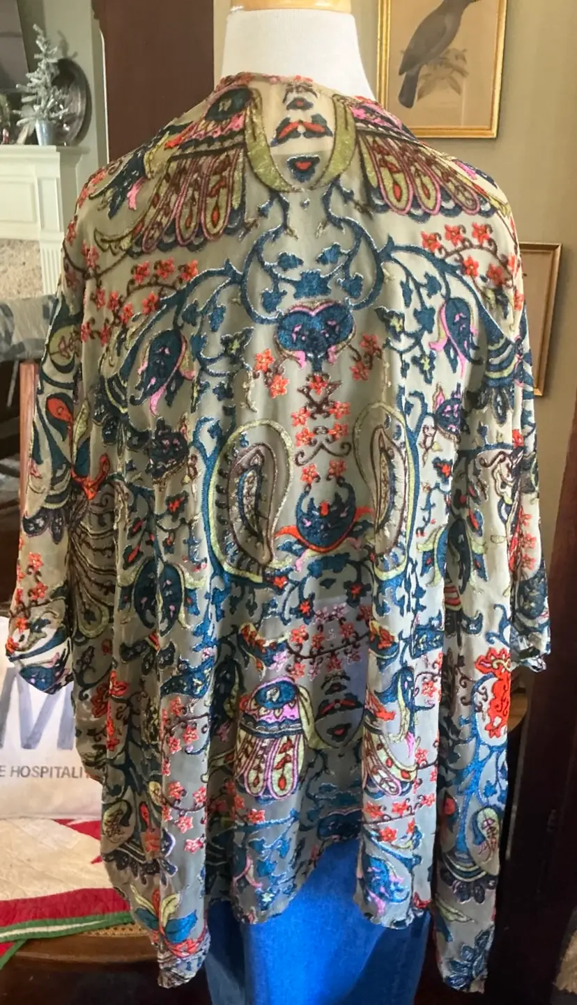 This Wrap Blouse is a Semi Sheer Open Front Burnout Velvet Top. One Size.