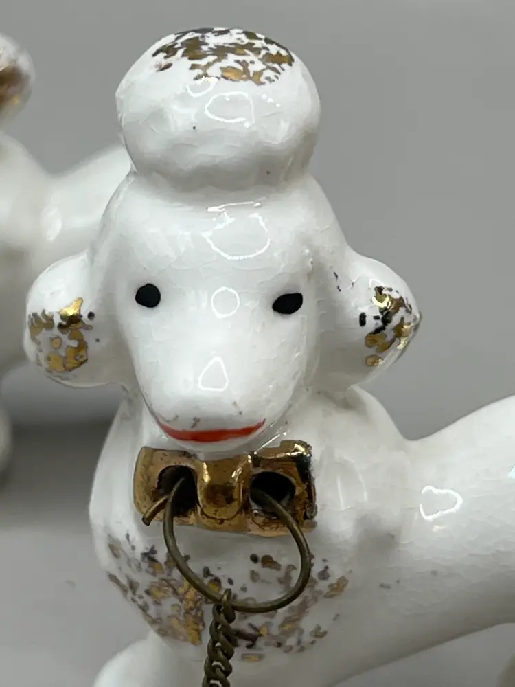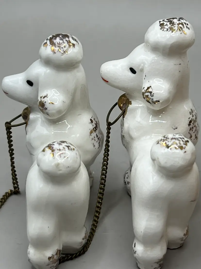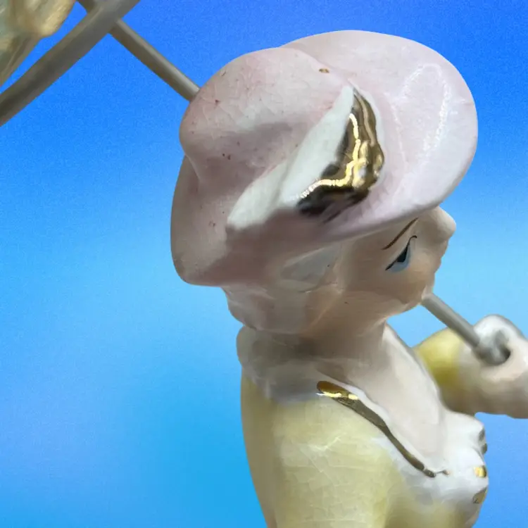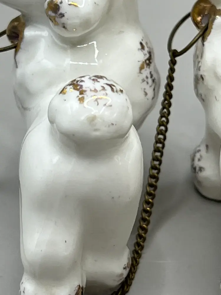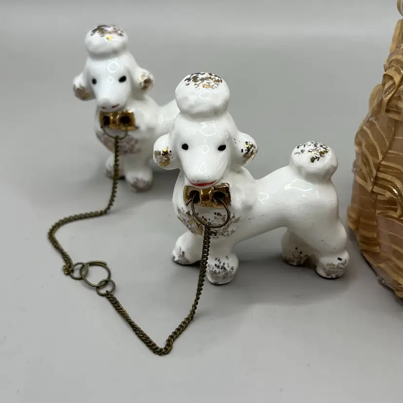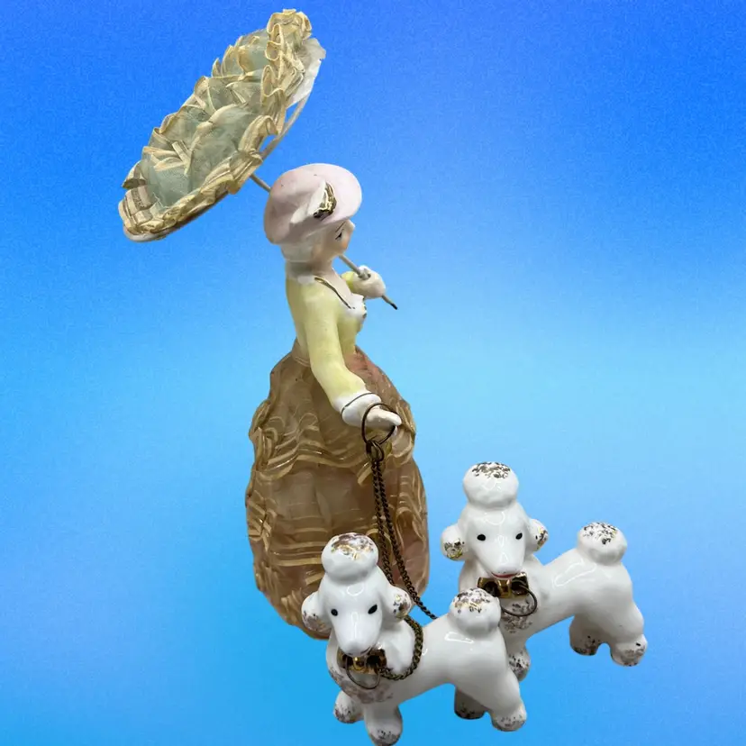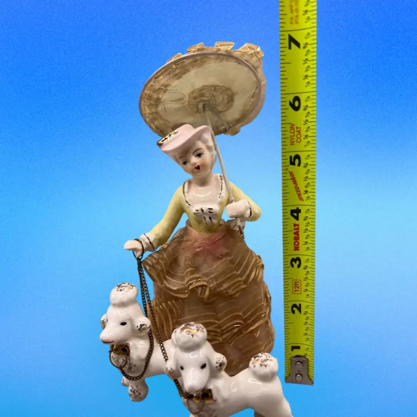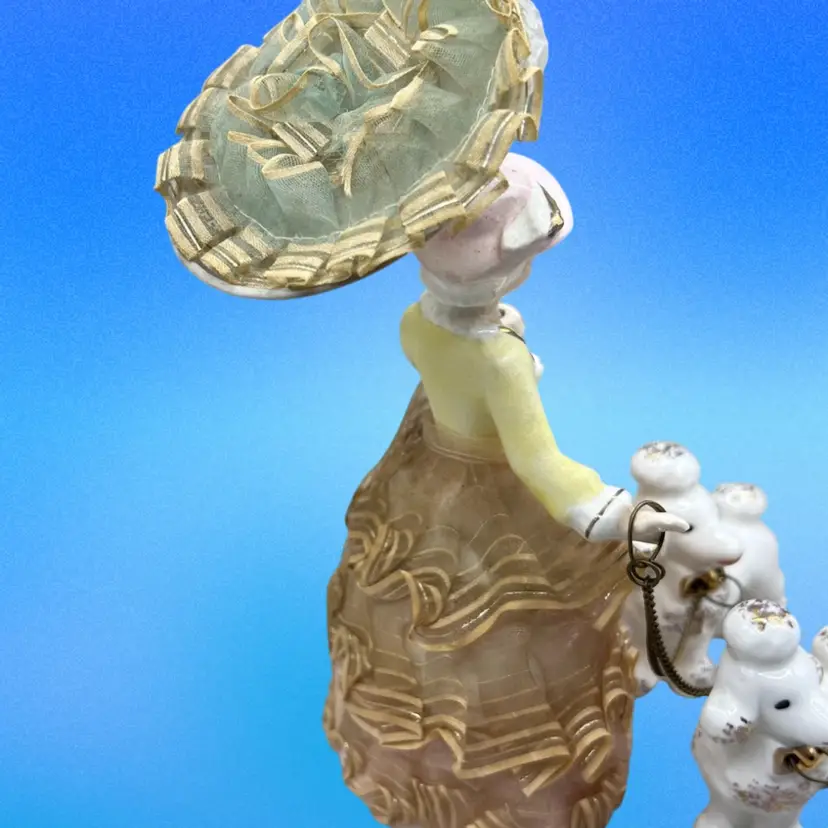 No chips! There is crazing on the girl and the poodles. Possible gold loss on her hat. The lace dress and parasol may have discolored. One of the poodles has some rough spots on his tail. The ring of the leash comes off of her hand easily. Please see all pictures!