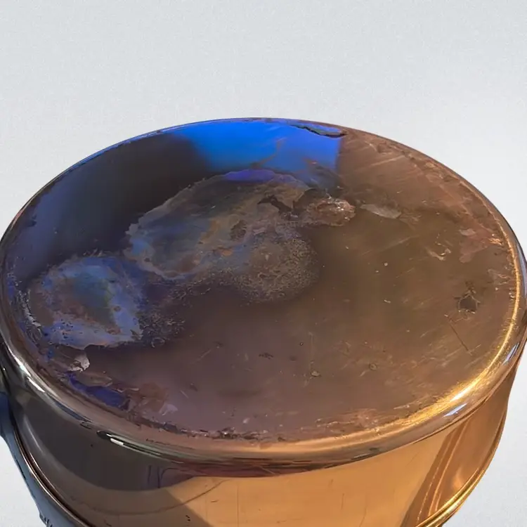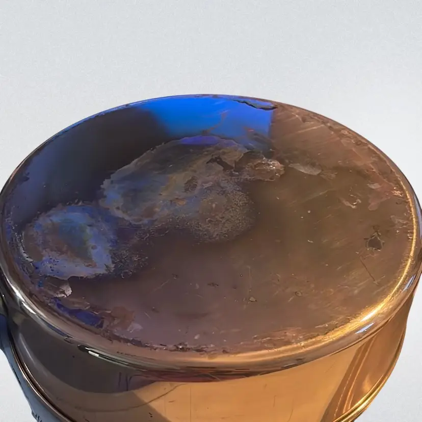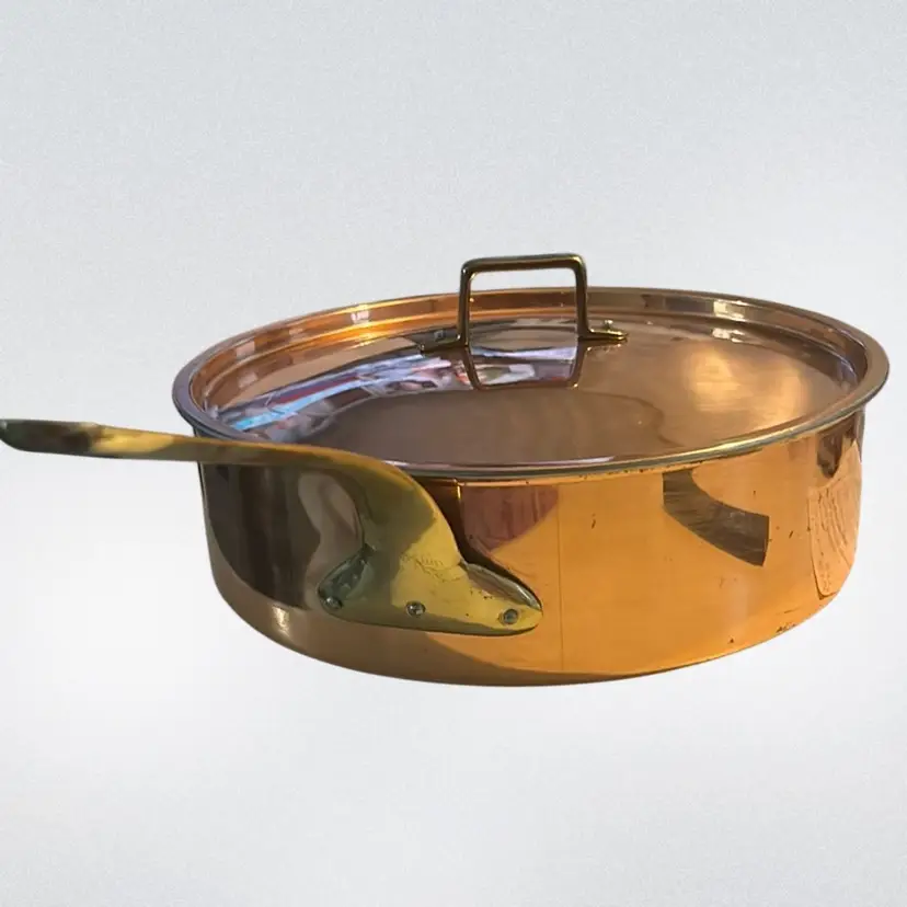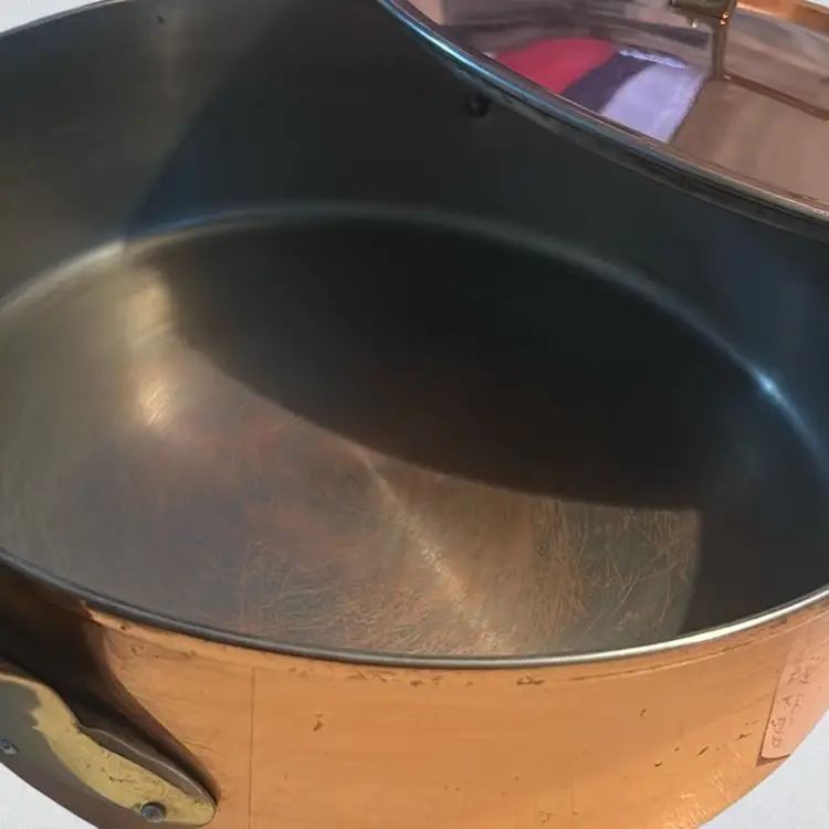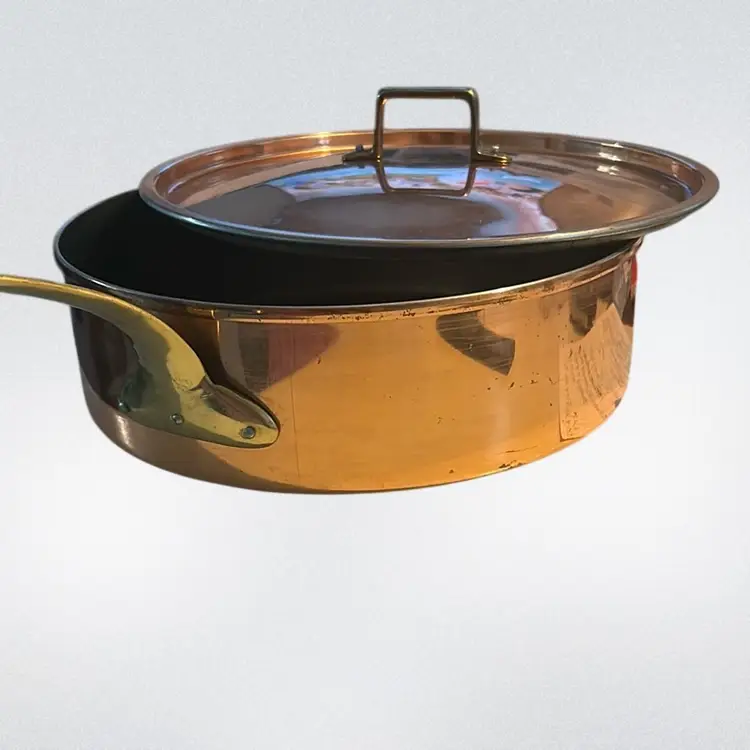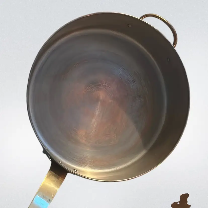 The discoloration in your stainless steel pan is a common occurrence known as heat tint or rainbow discoloration. It is caused by a thin layer of chromium oxide that forms on the surface of the pan due to high temperatures. While it may look unsightly, it is perfectly safe to continue using the pan as it does not affect its performance or safety. Constructed from solid copper with brass handles and an interior typically lined with tin or stainless steel to prevent reactions with acidic foods. Features a shallow, flat-bottomed cylindrical shape with a well-fitting lid, ideal for sautéing, searing, and braising. It measures approximately 12 inches in diameter 4 inches tall and the handle is approximately 10 inches long.