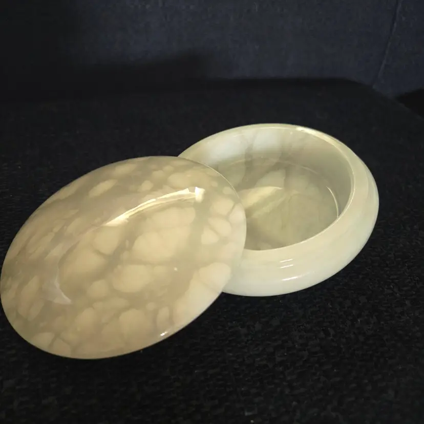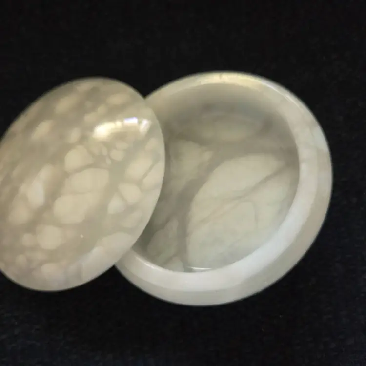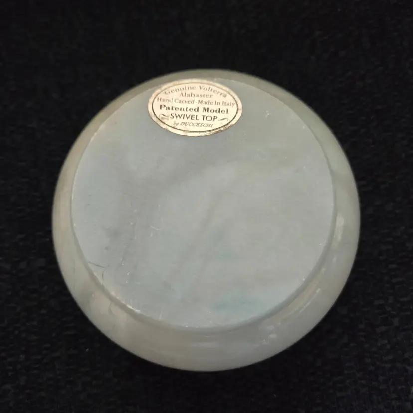 Vintage Ducceschi genuine Volterra Alabaster Trinket Box. It is round with a glossy finish and is medium sized. Measures 1 1/4" tall and is 4 1/4" around. It swivels from left to right and is a beautiful light green and white color. Perfect for your treasures. No chips, cracks, or repairs.
