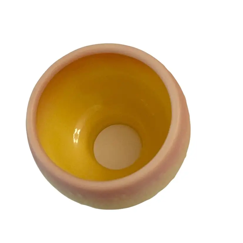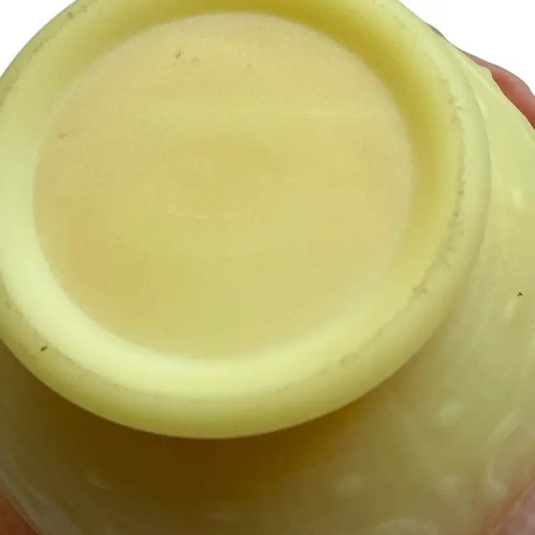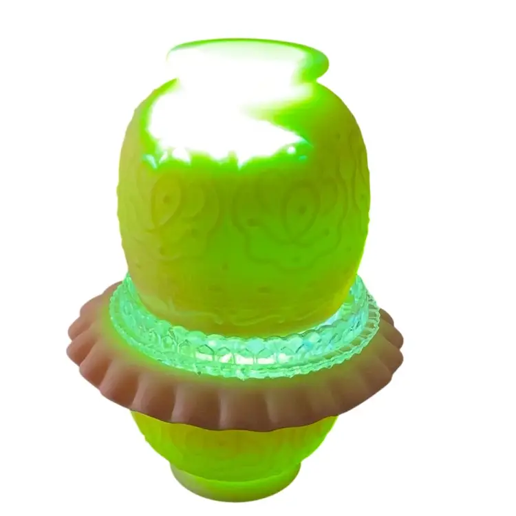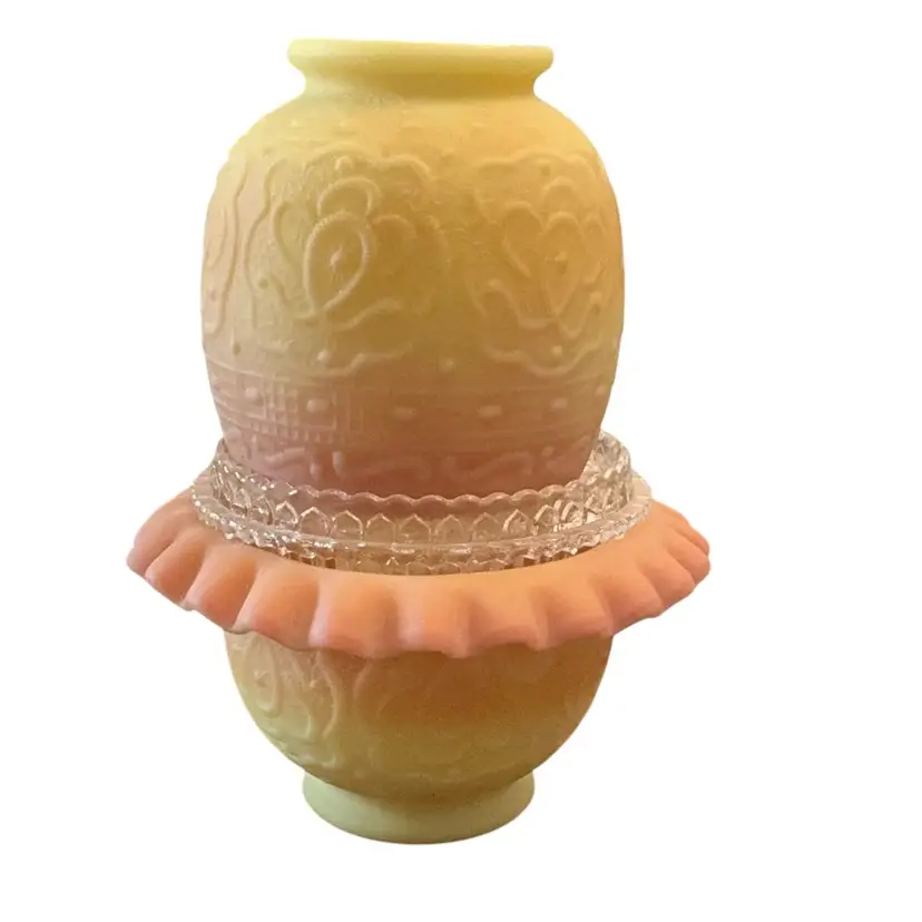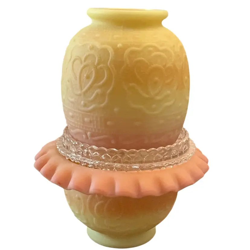 Beautiful glowy Burmese Satin fairy lamp in the Persian Medallion design. Has Fenton logo stamped on base. It is somewhat worn so I can’t make out the decade this piece was produced. But according to my research that style was made between 1986-1987.