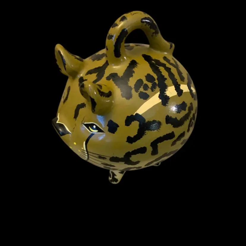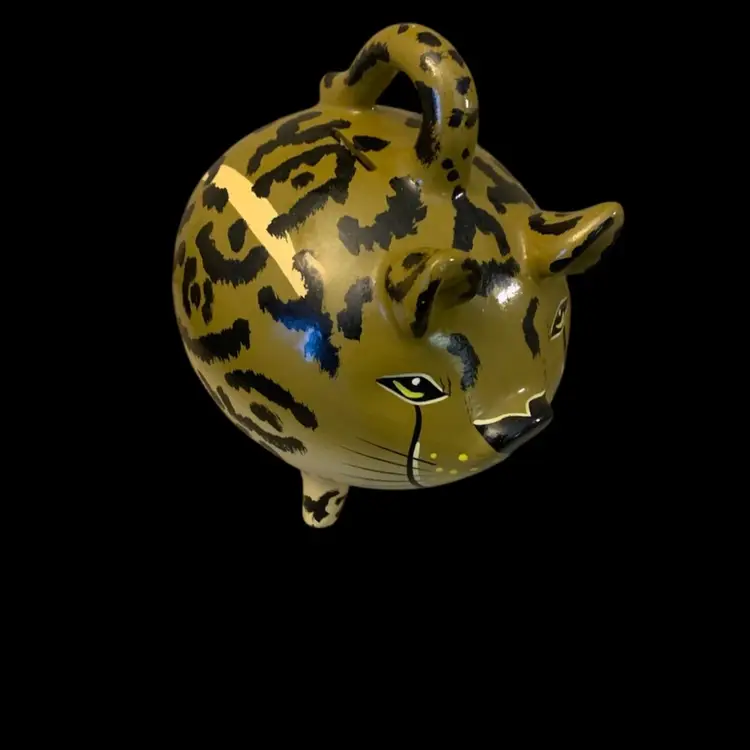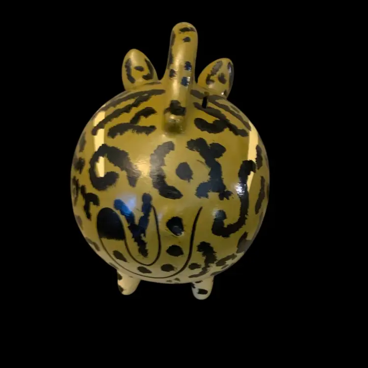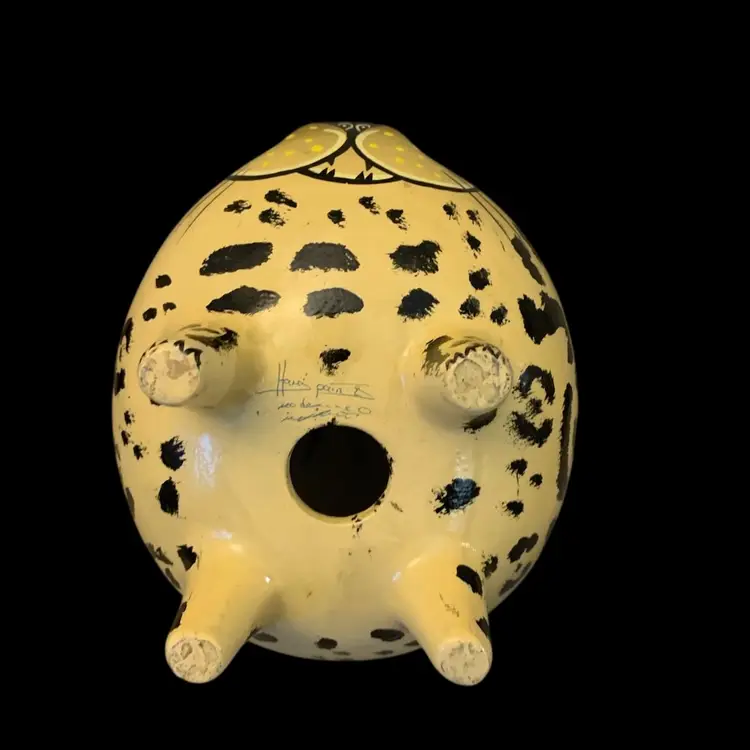 Hand painted. Can’t read the rest. No chips or cracks. 5 1/4 x 6 1/2 x X 7 1/2 inches
