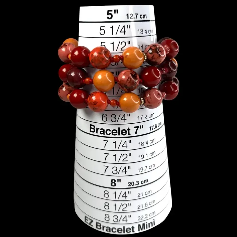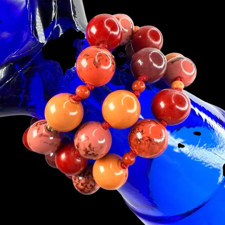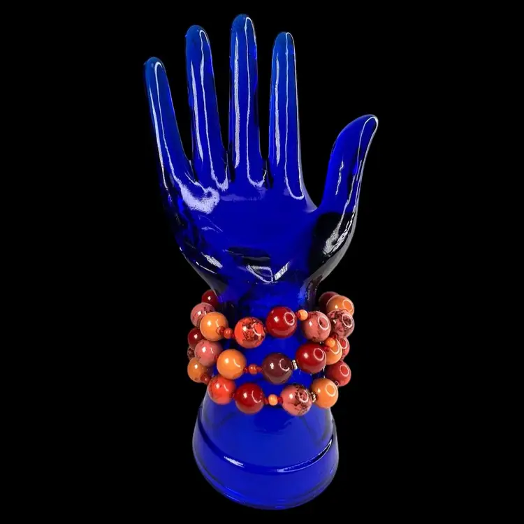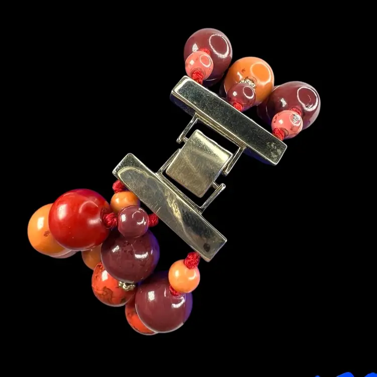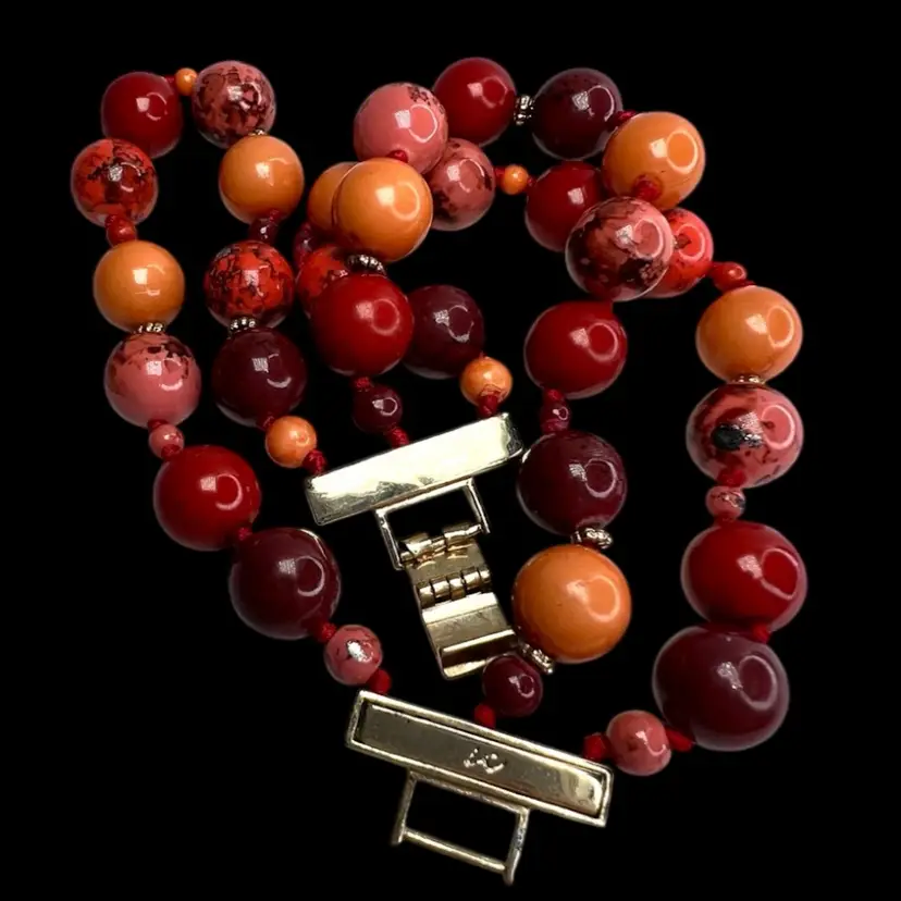 Liz Claiborne 3-strand Bracelet Signed “LC” on gold-tone clasp Shades of orange & red plastic beads Knotted between each bead Fits 6-1/2” Wrist Condition: Wonderful, light surface scratching on clasp
