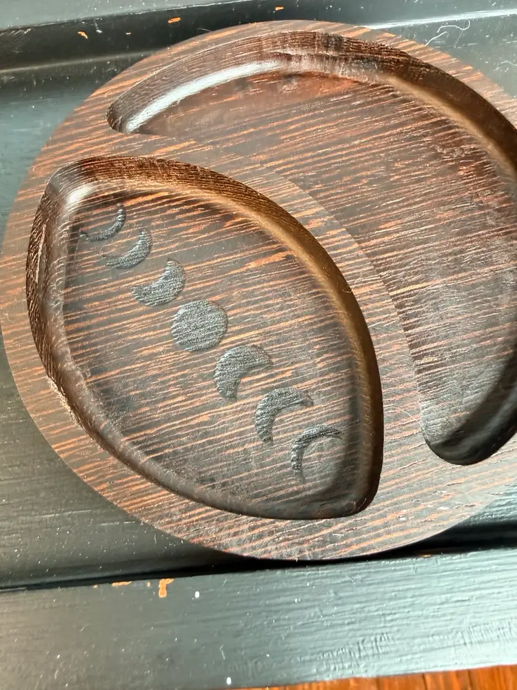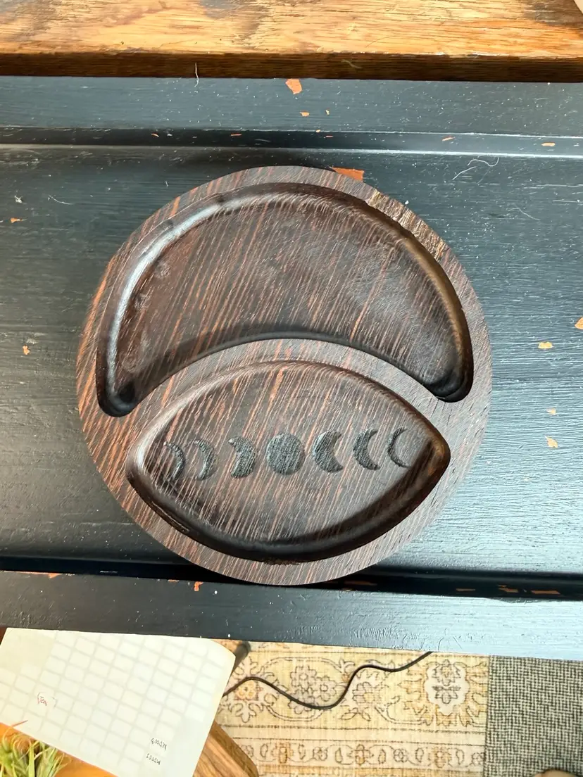 This ring dish is 5” round with two separate spots for jewelry and more. The moon phases are engraved for a final touch.