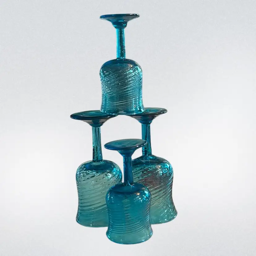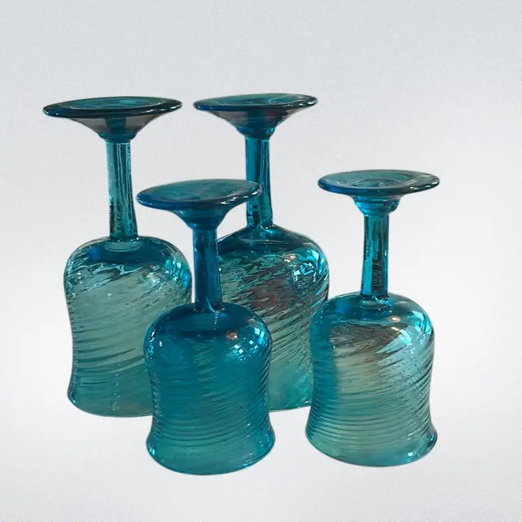 This set of blue swirl hand-blown goblets are to artisanal glassware, Mexican in origin, featuring a distinct textured swirl pattern. Hand-blown stemware. Teal blue color with a spiral, swirled texture. Slight variations due to the handmade process and they have a pontil mark on the base. They all are in mint condition, no chips, cracks or repairs! The tallest goblet is approximately 6 1/2 inches tall and 3 inches in dummy ammeter at the mouth. The smallest glass is approximately 5 1/4 inches tall and 2 3/4 inches in diameter at the mouth. (BSA6)