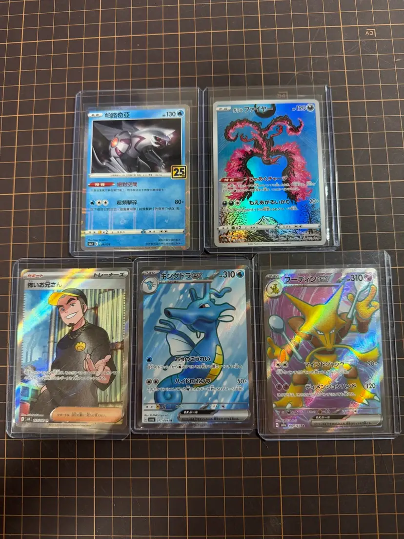 ✔ Palkia (25th anniversary stamp) ✔ Galarian Moltres AR ✔ Kingdra ex ✔ Alakazam ex ✔ Ruffian Supporter