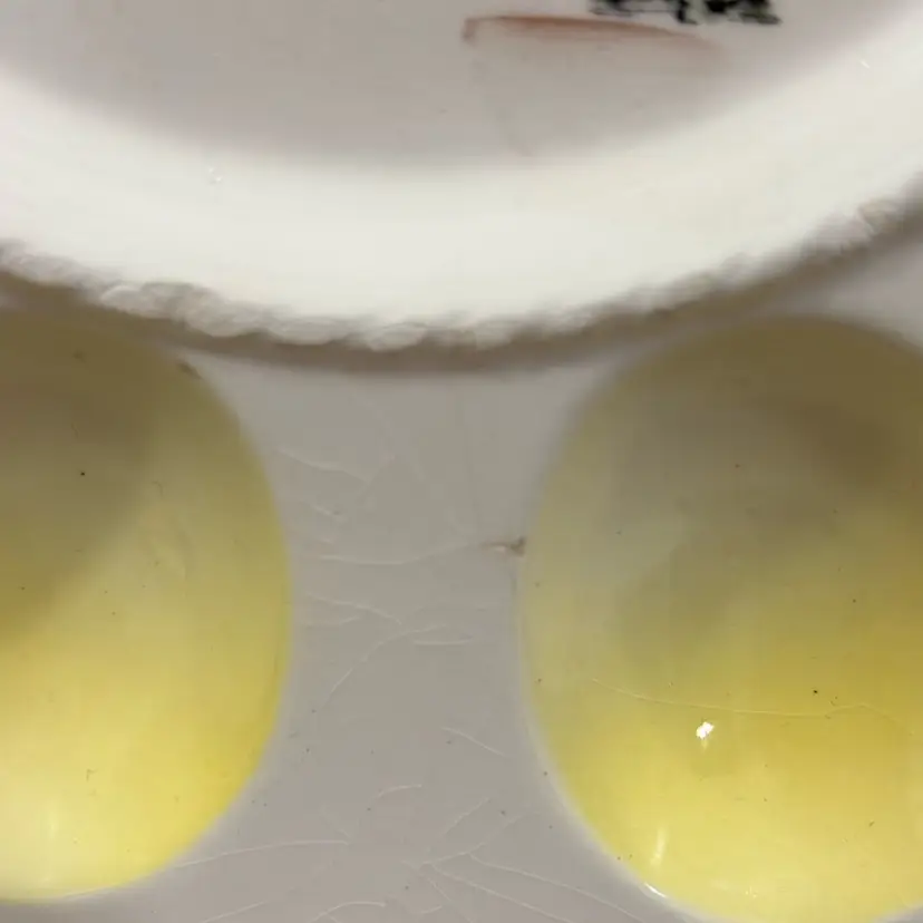 This is a vintage Norleans hand-painted porcelain deviled egg plate with a rooster and hen design. It features a colorful folk art rooster design motif in center. The plate has yellow trim around the wells and holds 10 egg halves. It measures approximately 9.5 inches in diameter. This specific design was made in Japan and is considered a collectible item.