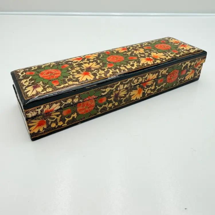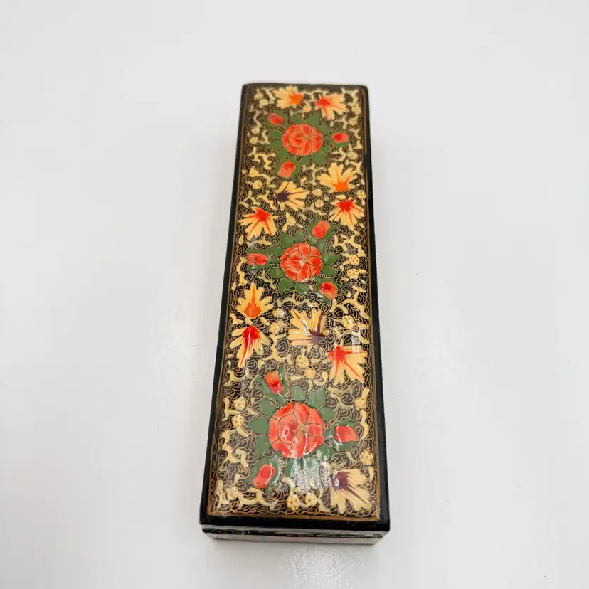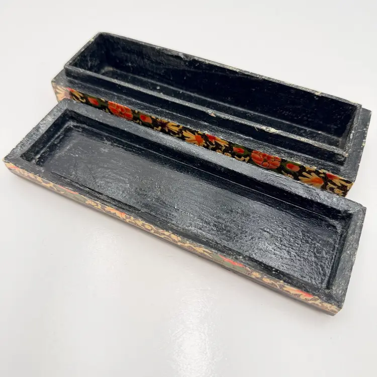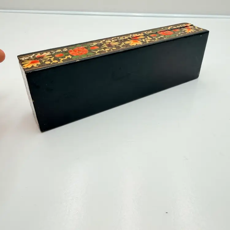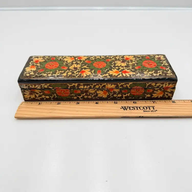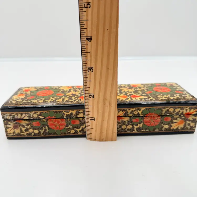 As shown 1.5 inches tall by 8 inches long Some dings on the wooden base and inside