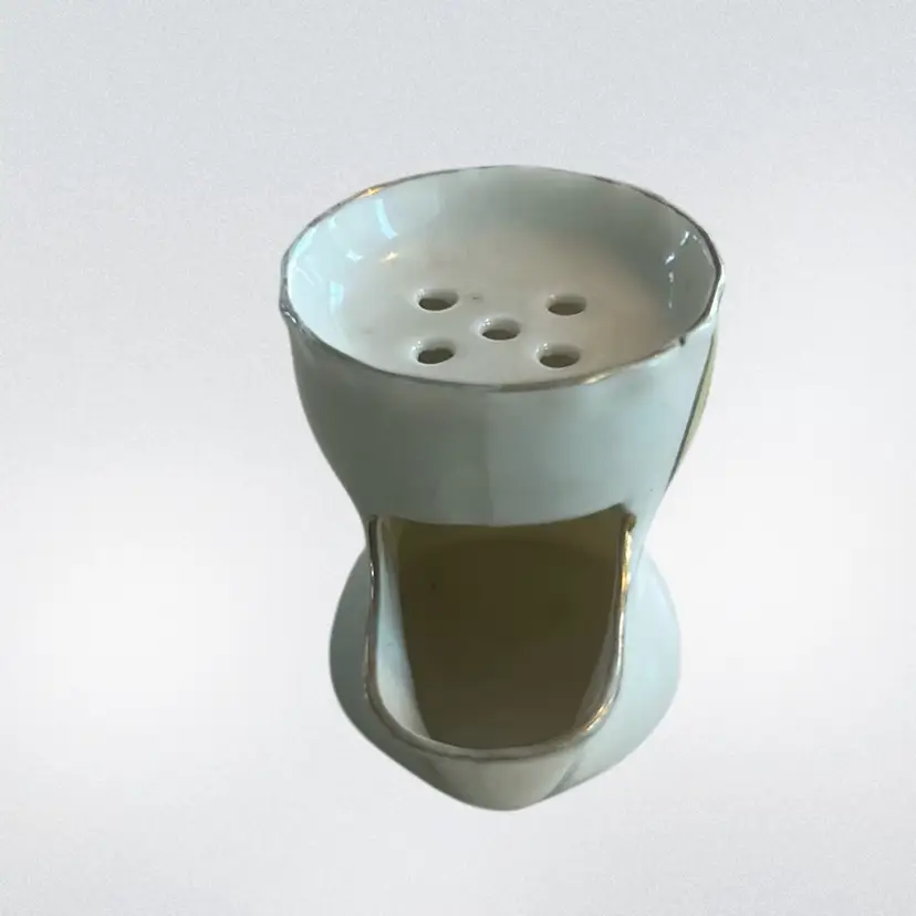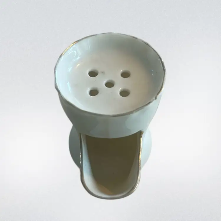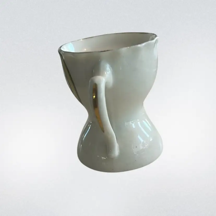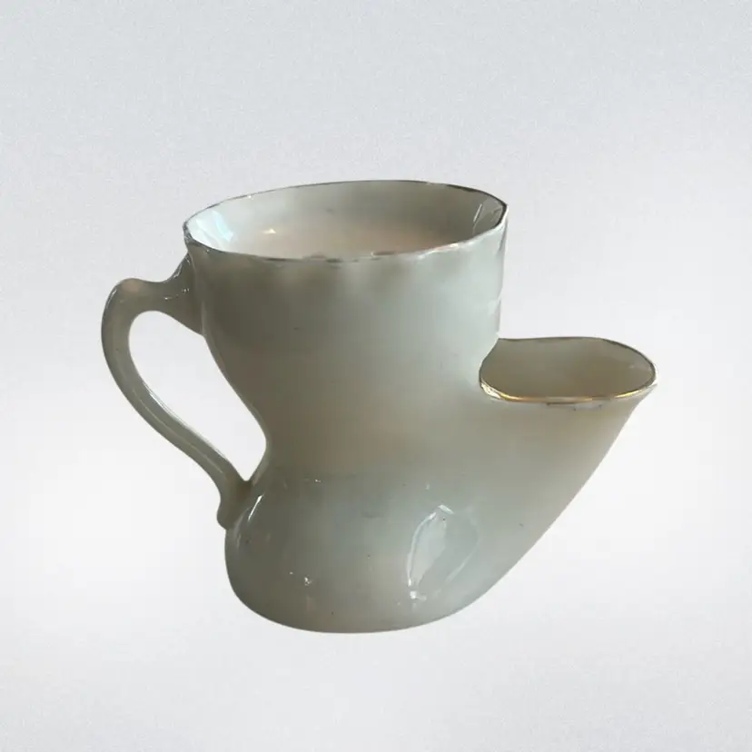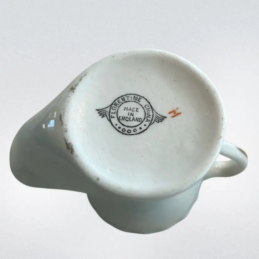 A nautical theme with a "ship" graphic and the text "Carbone Carbasoque Methil". Historically, the spout was used to hold hot water to keep shaving soap warm and lathered. Marked made in England, Florentine China, the Mark has wings as seen it in the picture. It measures approximately 2 inches tall and handle to spout approximately 2 1/2 inches wide. It is in mint condition, no chips, cracks, repairs or crazing. (BSA2)