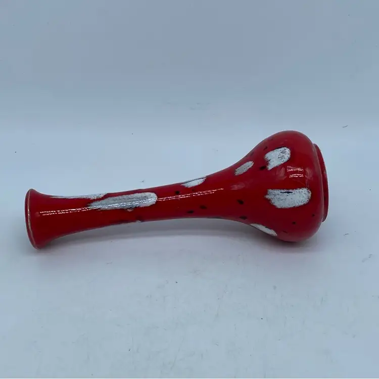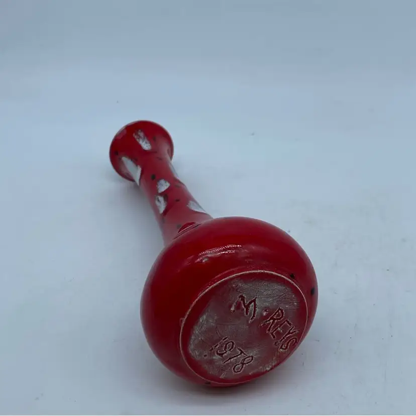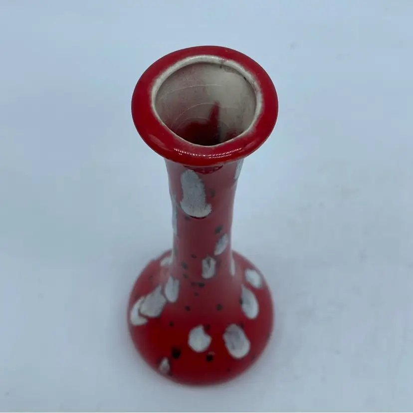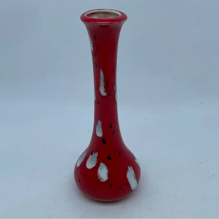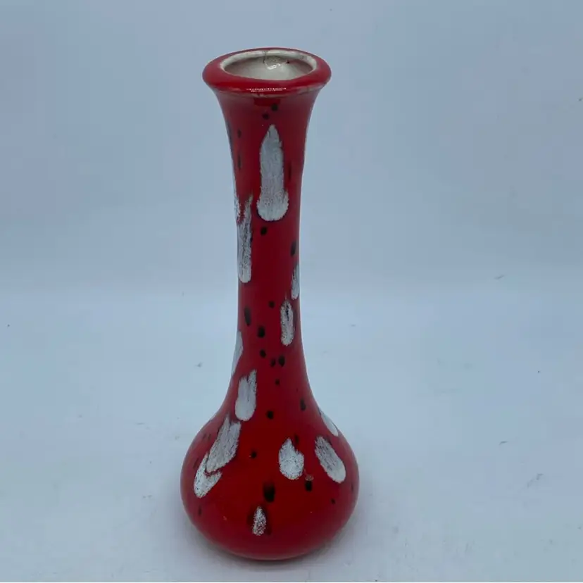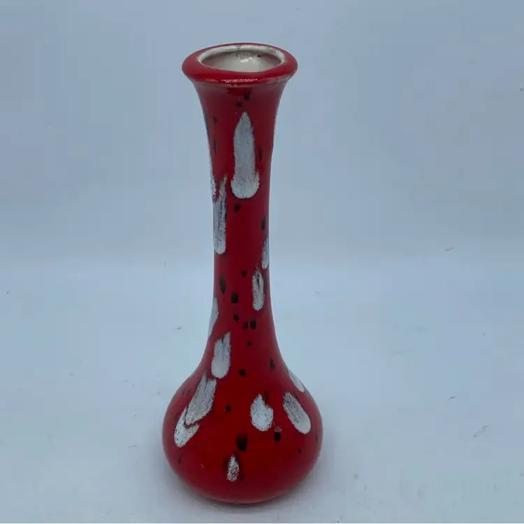 This particular vase, with its vibrant red base and contrasting white and black spatter, evokes a mid-century modern aesthetic. Such pieces were common in the latter half of the 20th century, often produced by smaller ceramic studios or as mass-produced decorative items. Its design suggests it was intended for display rather than utilitarian use.