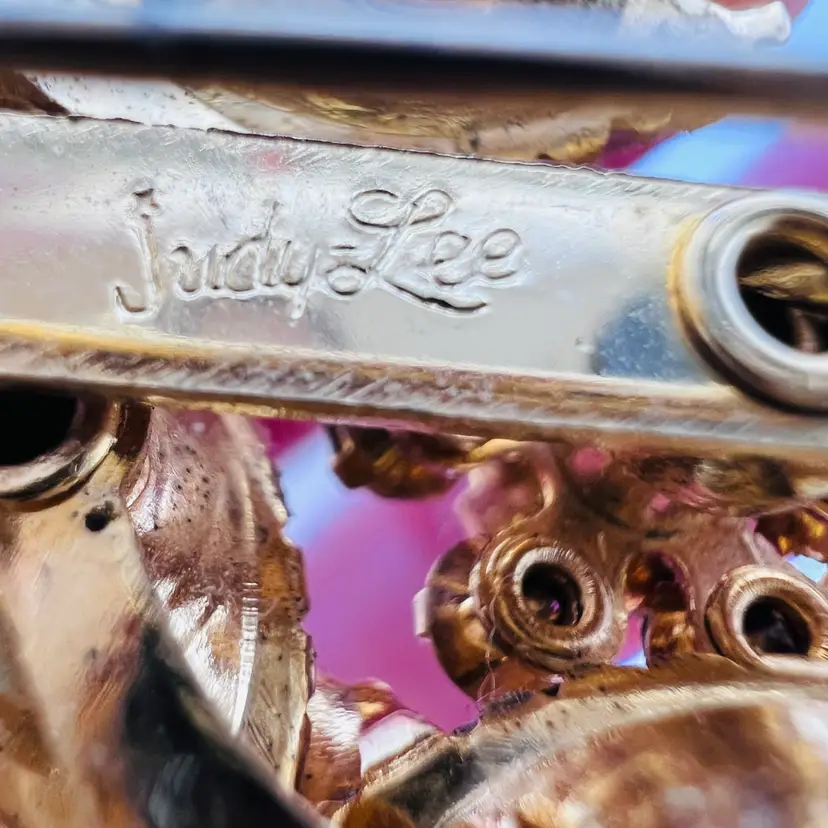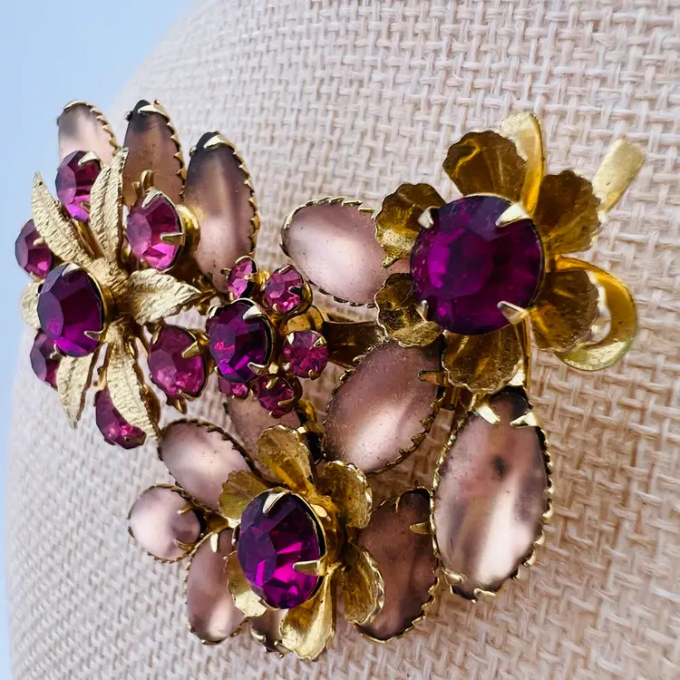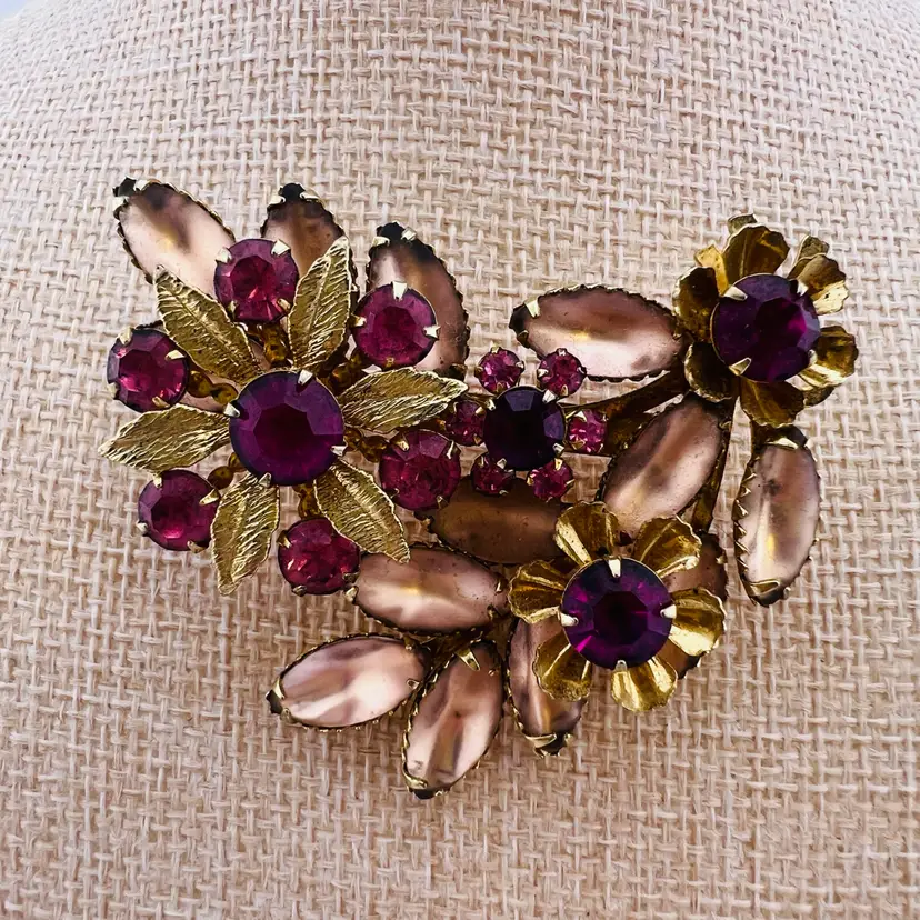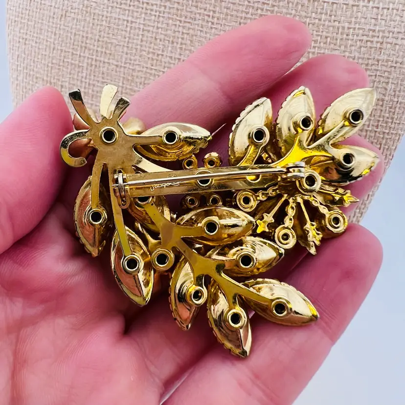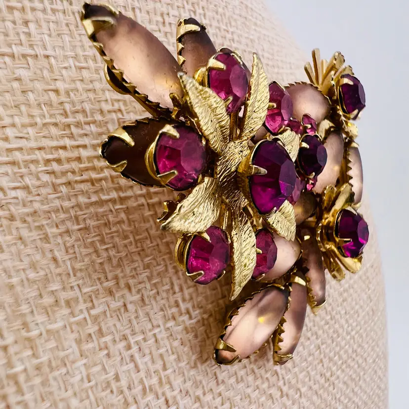 Vintage 1950s Judy Lee Pink Rhinestone Floral Spray Gold Tone & Frosted Brooch 2.25โ€