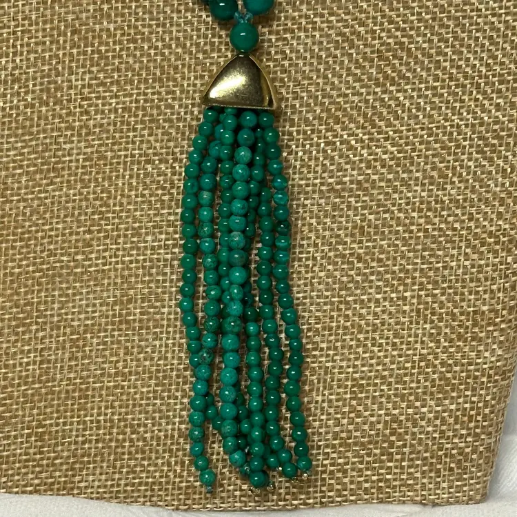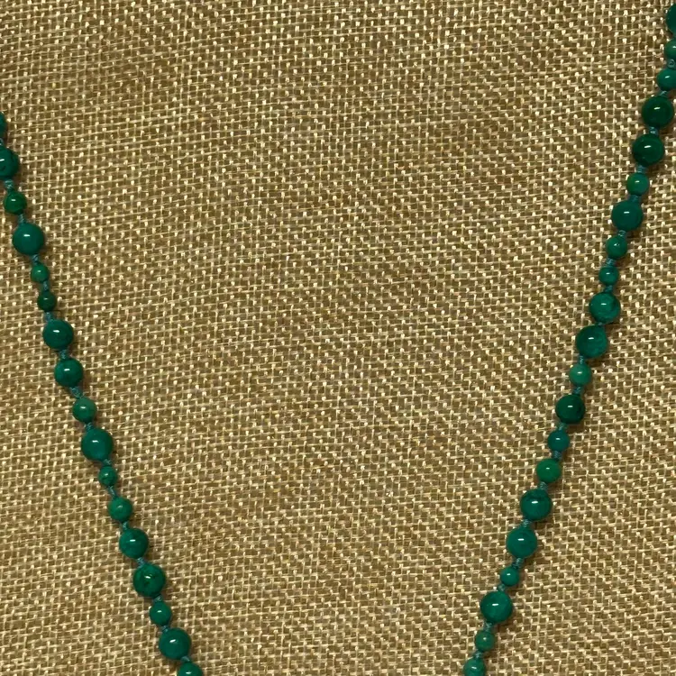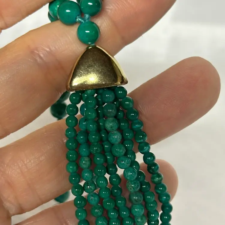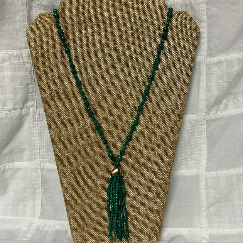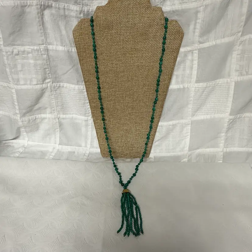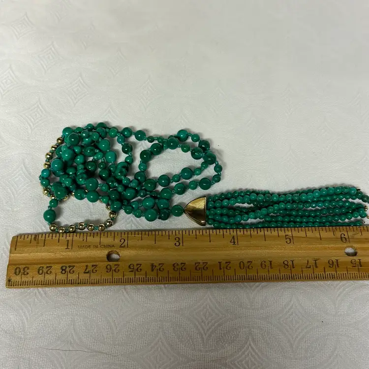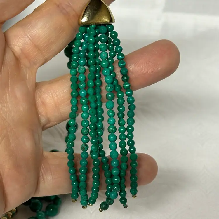 Just stunning! I believe it’s a malachite stone; although it may be a faux malachite. It’s definitely stone. Very nice condition. Very well done. 32” with 3 1/2” tassel.