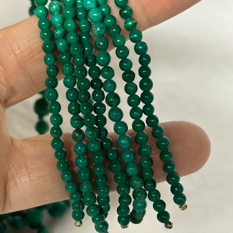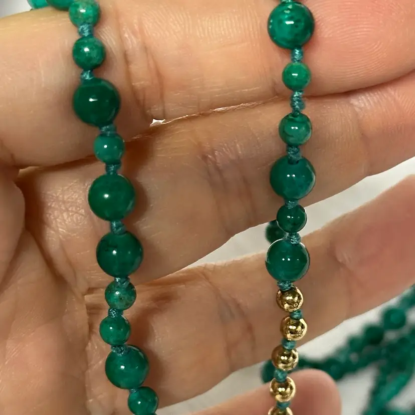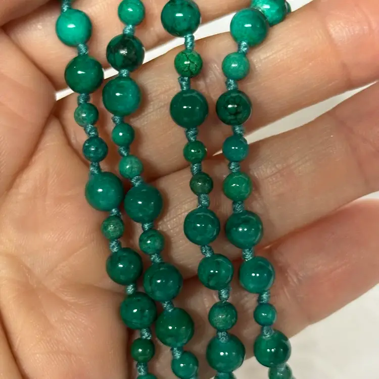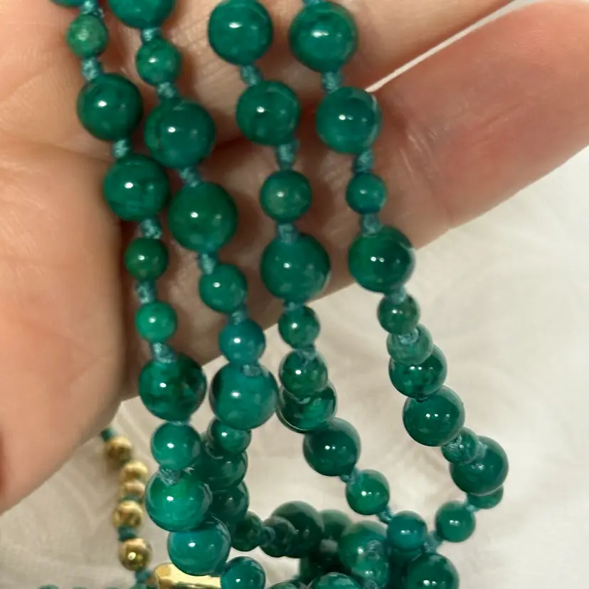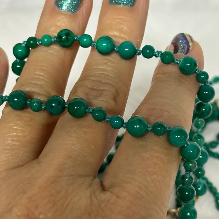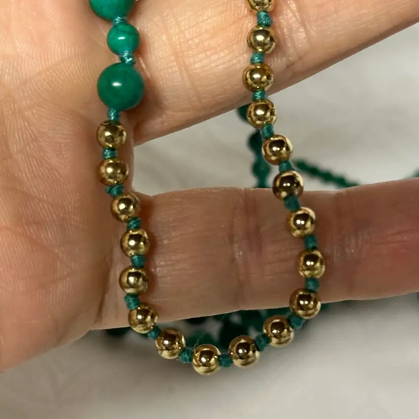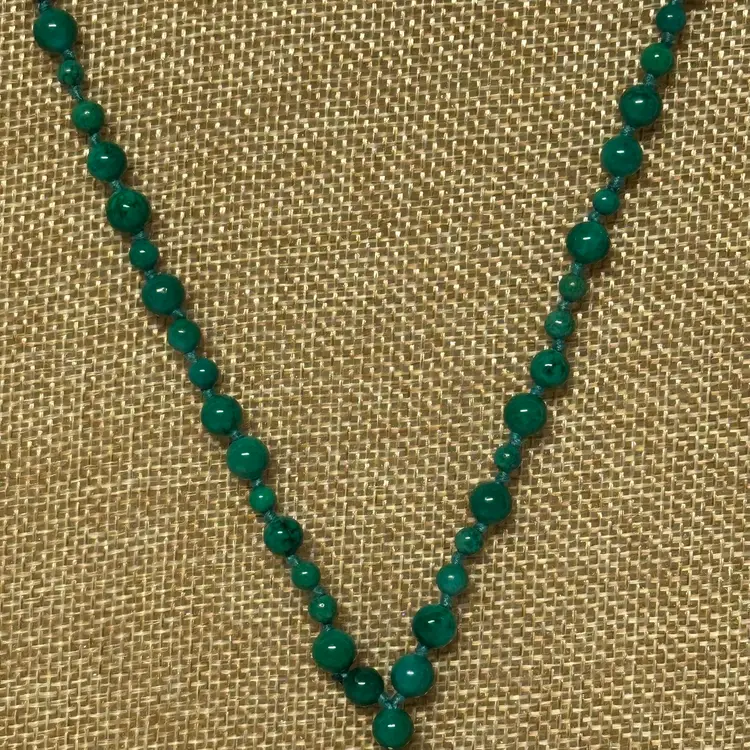 Just stunning! I believe it’s a malachite stone; although it may be a faux malachite. It’s definitely stone. Very nice condition. Very well done. 32” with 3 1/2” tassel.