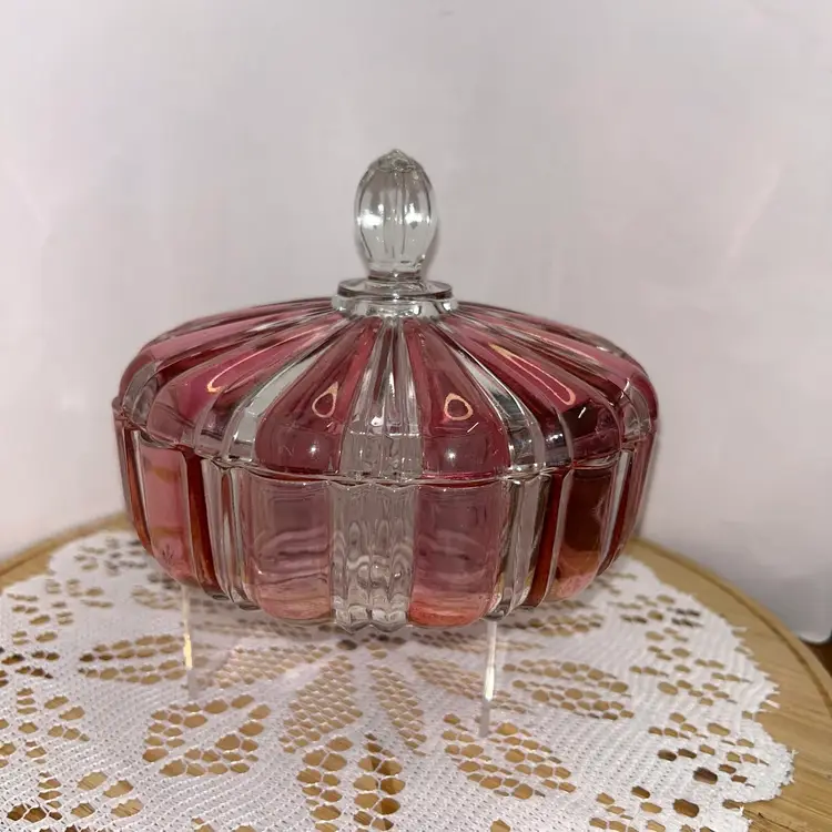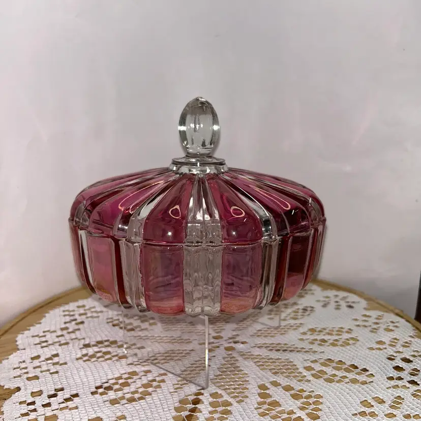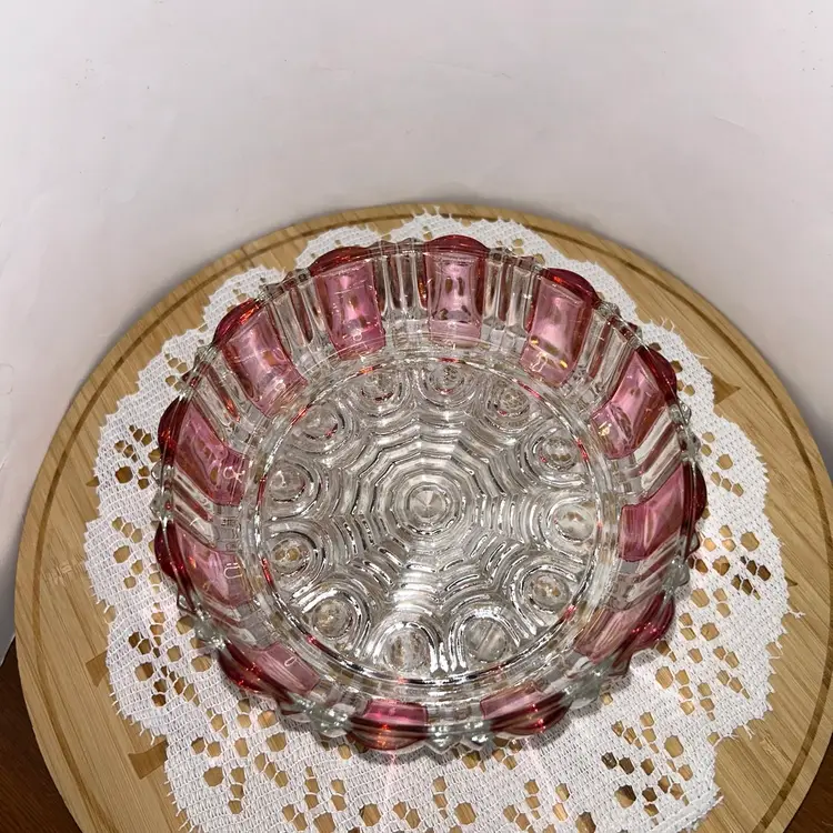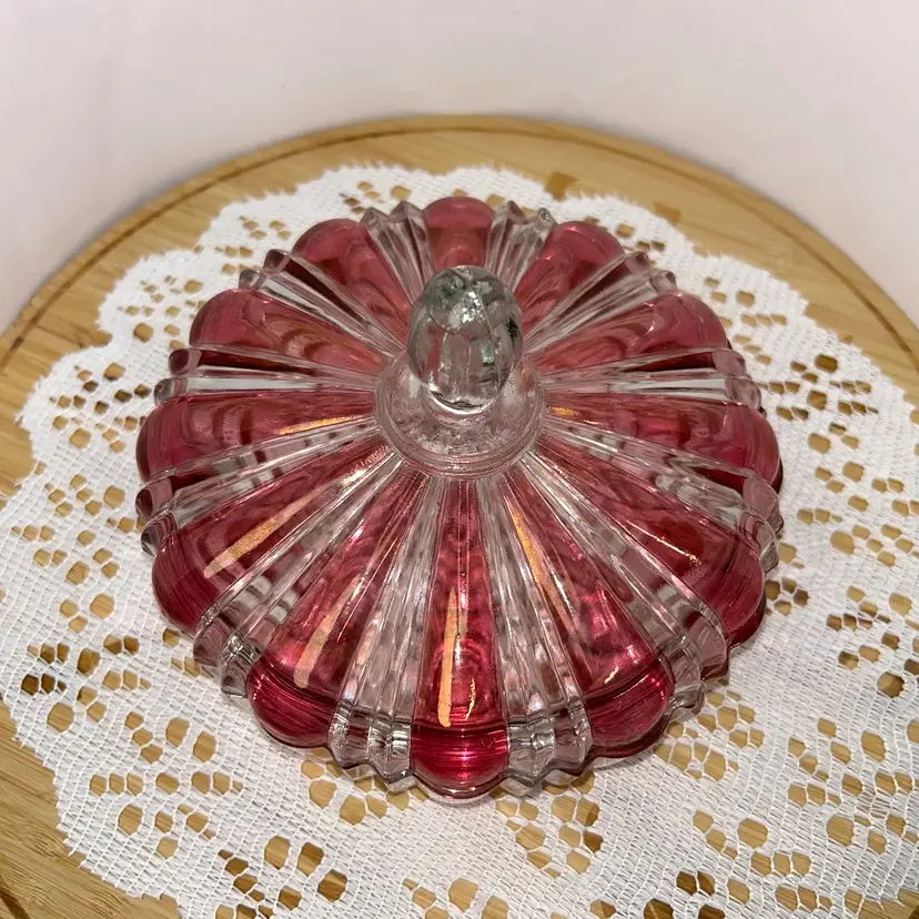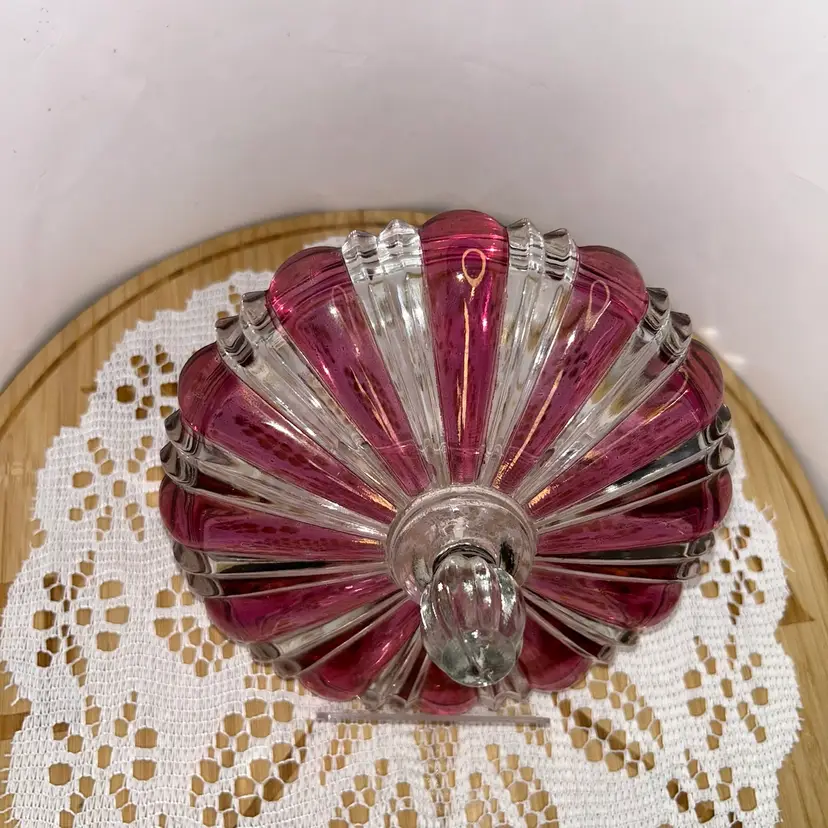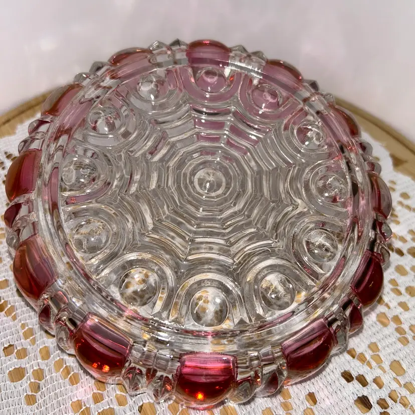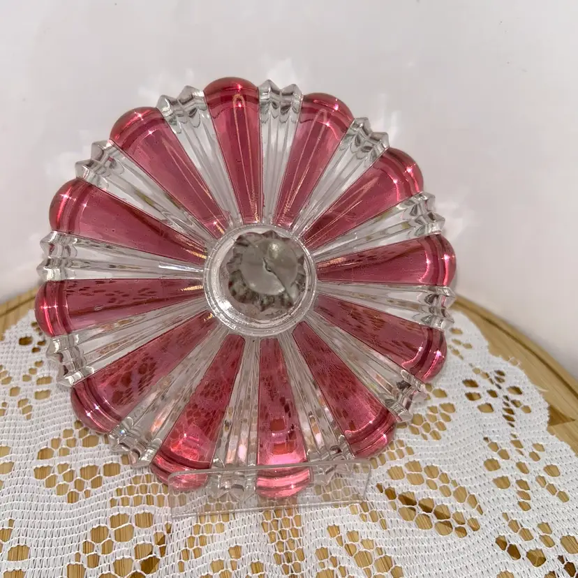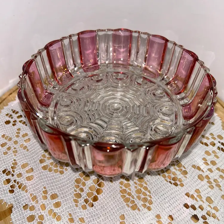 Manufactured 1936-40. Measures 7” diameter across top, 5” tall to top of handle, dish alone is 2” tall. Often labeled as cranberry-flashed on “spiderweb design”. Alternating Ruby and clear ribs are Art Deco inspired. Absolutely gorgeous condition. No flashing wear, chips, or cracks.