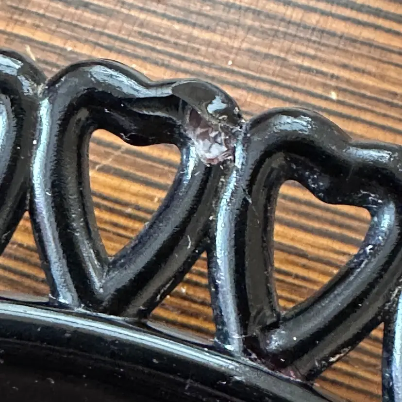 Pair of 7 inch black amethyst glass plates. Chip in heart lattice of one plate as shown. Possibly Westmoreland.