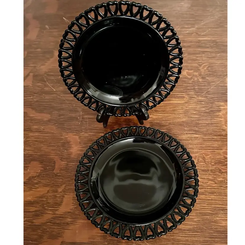 Vintage Black Amethyst Glass Plates with a Heart-shaped Lattice Edge - 7 Inch