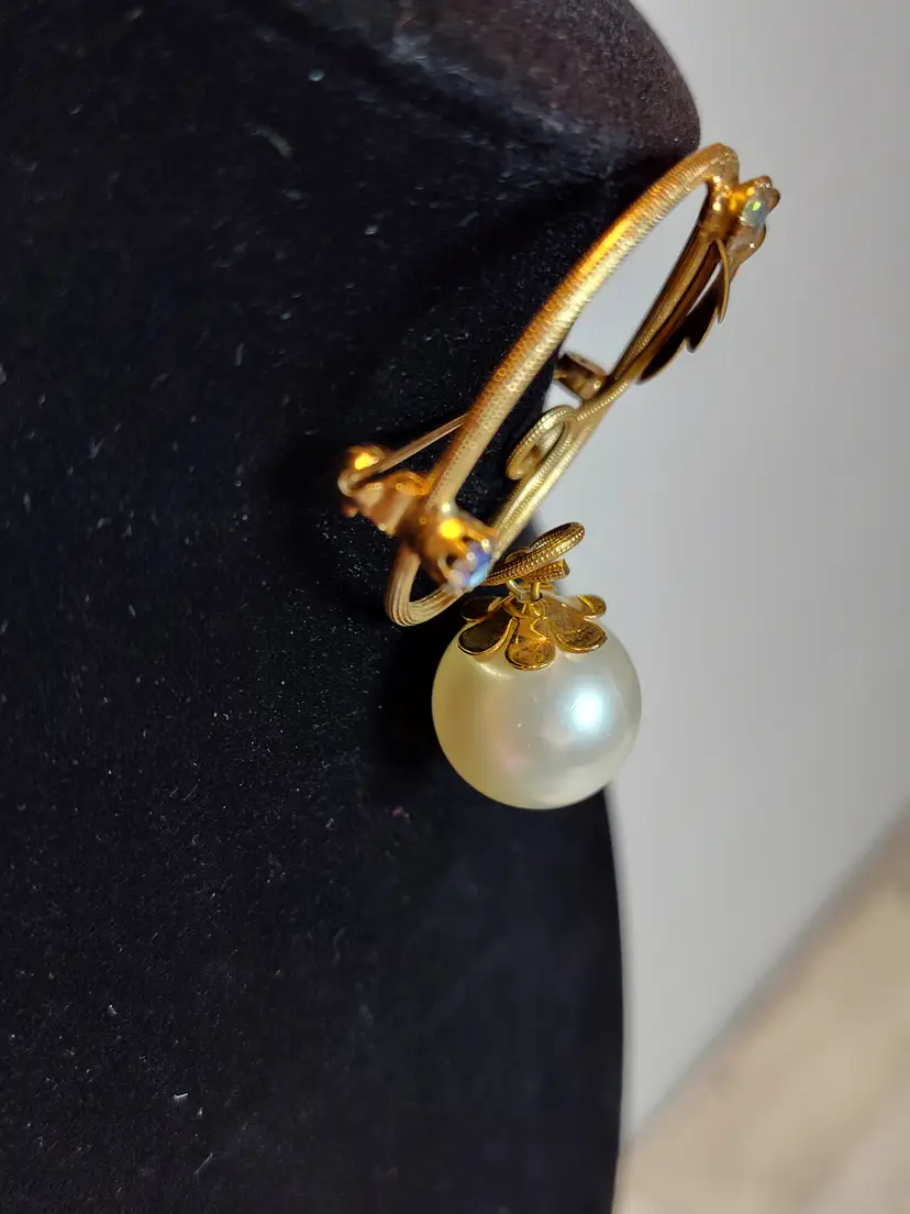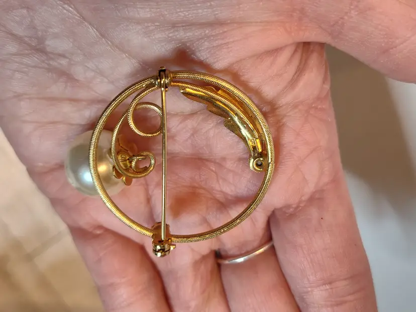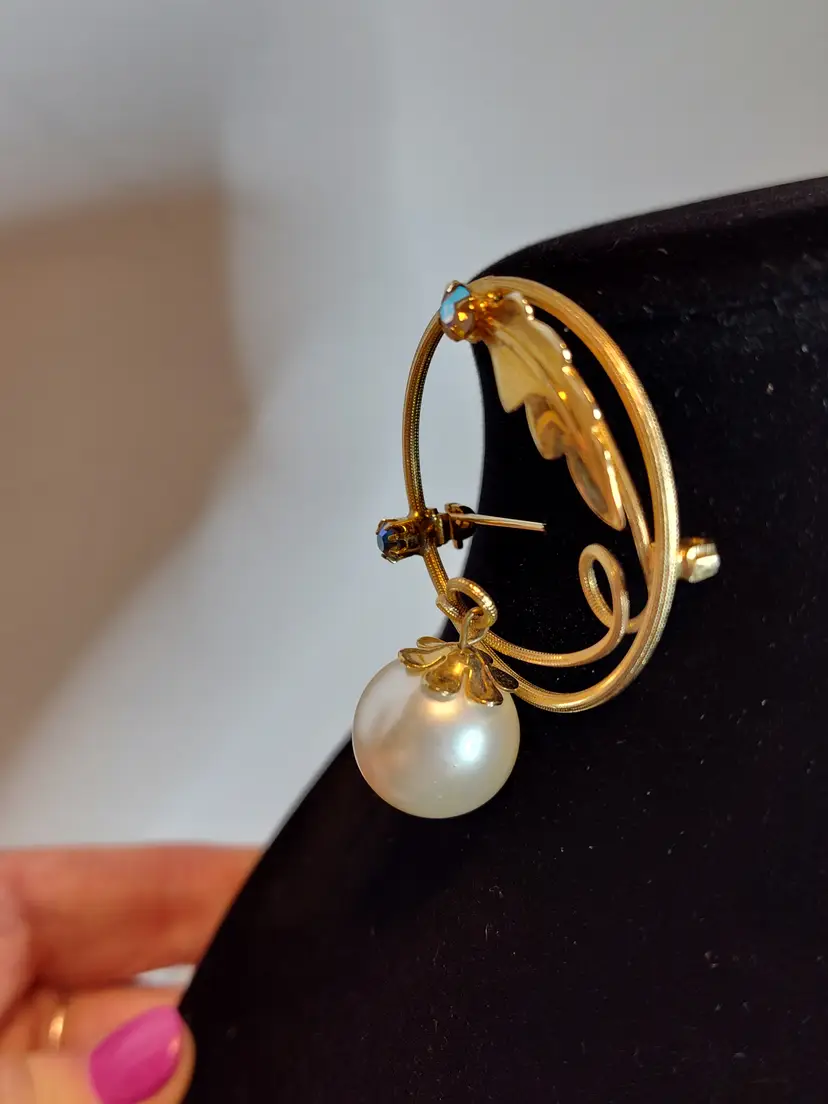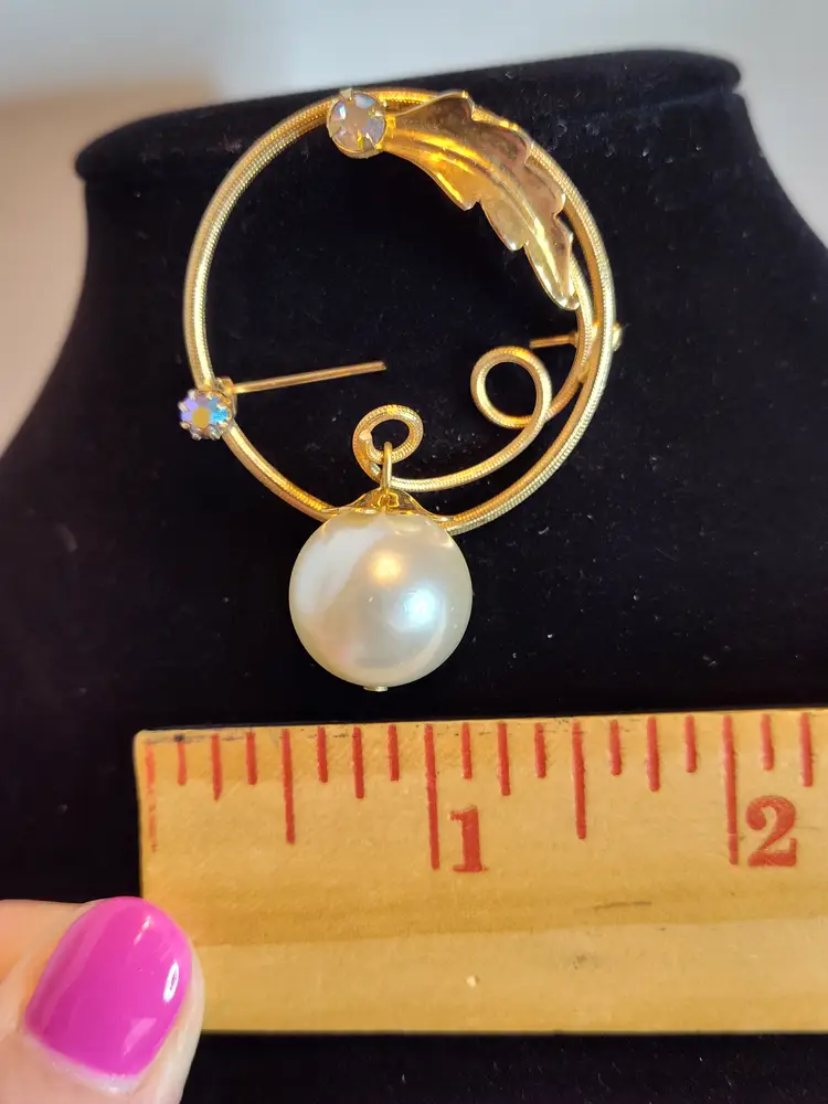 1.75" round gold tone brooch with AB blue & clear rhinestone with center dangle faux pearl.