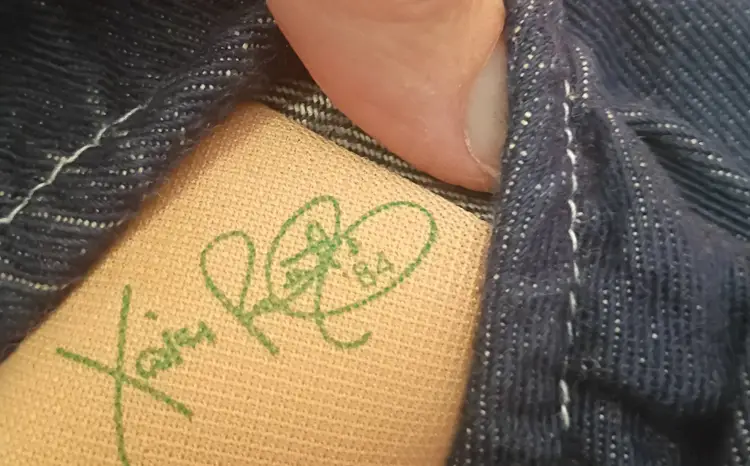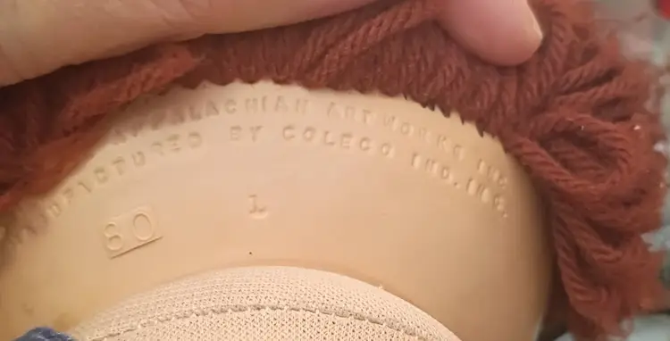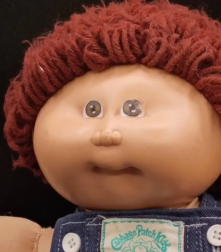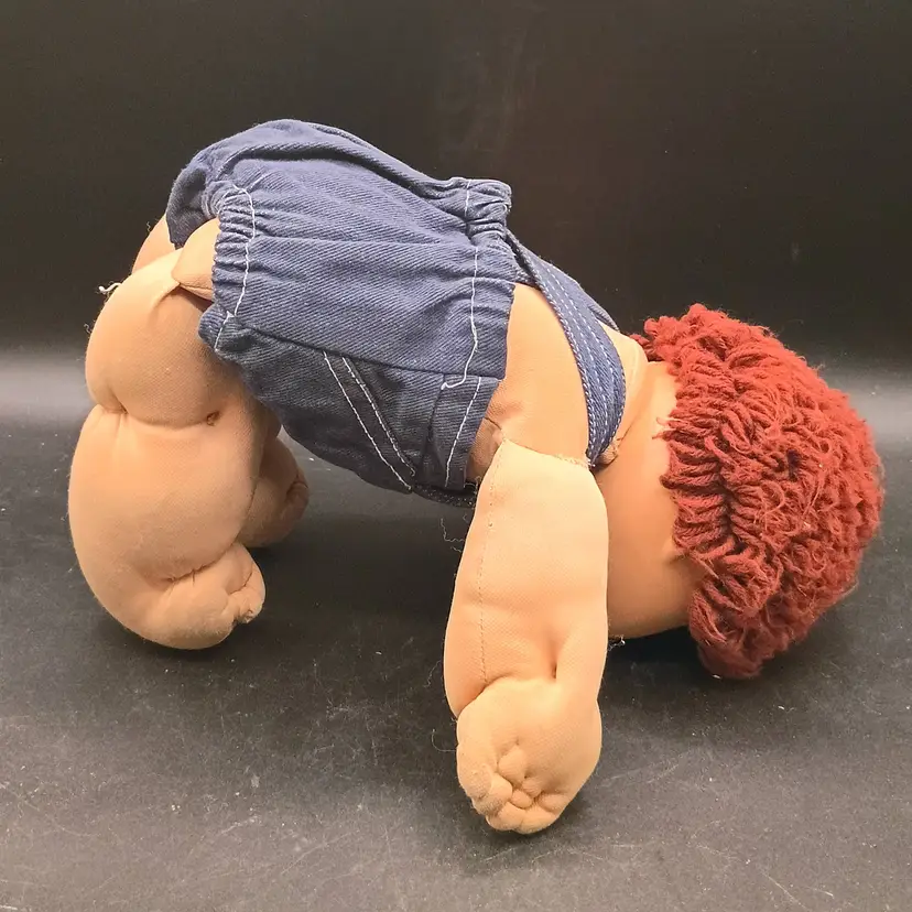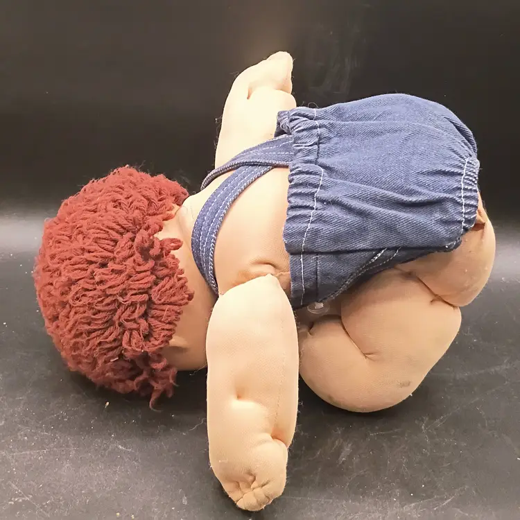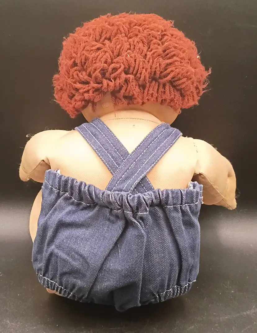 This product is a vintage Cabbage Patch Kids doll with brown curly hair, brown eyes, and green complexion. It is signed and dated 1984, making it a collectible item from the 1980s. The set includes only the doll, without packaging, and is ideal for all occasions. The brand, Cabbage Patch Kids, is known for its original baby dolls, and this boy doll is a unique addition to any doll collection. He is wearing overalls but has no diaper, socks or Shoes.