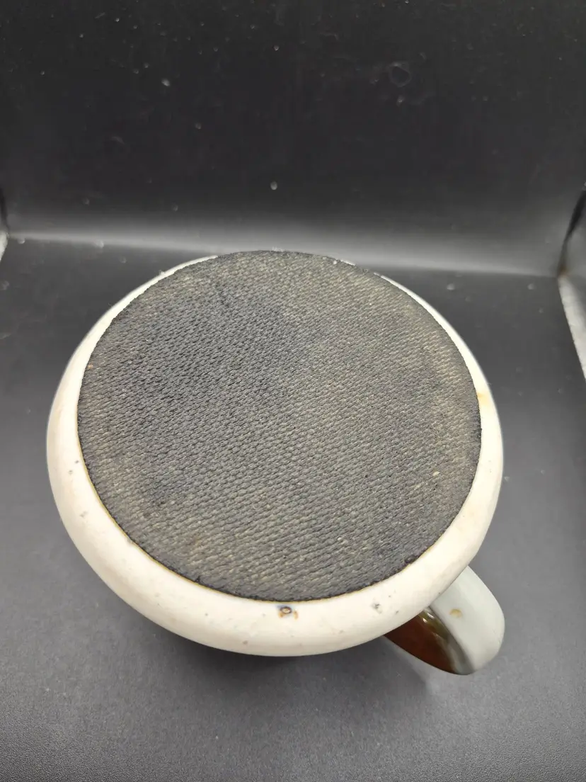 Some discoloration and wear inside the mug, with visible glaze imperfections and minor stains. 4 inches tall, base diameter 3.5 inches.