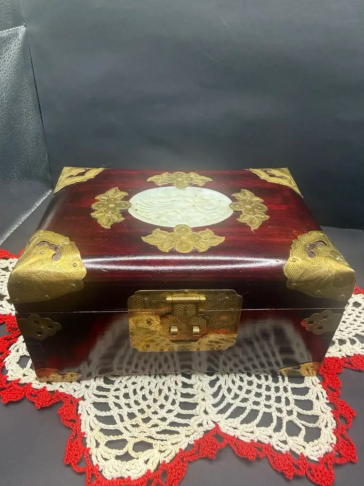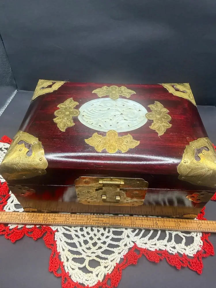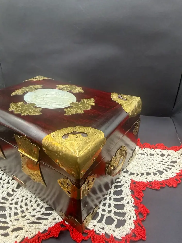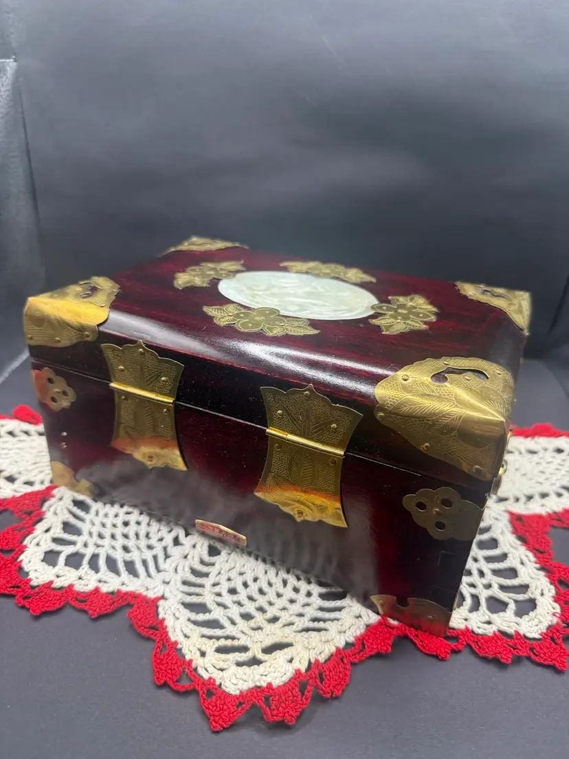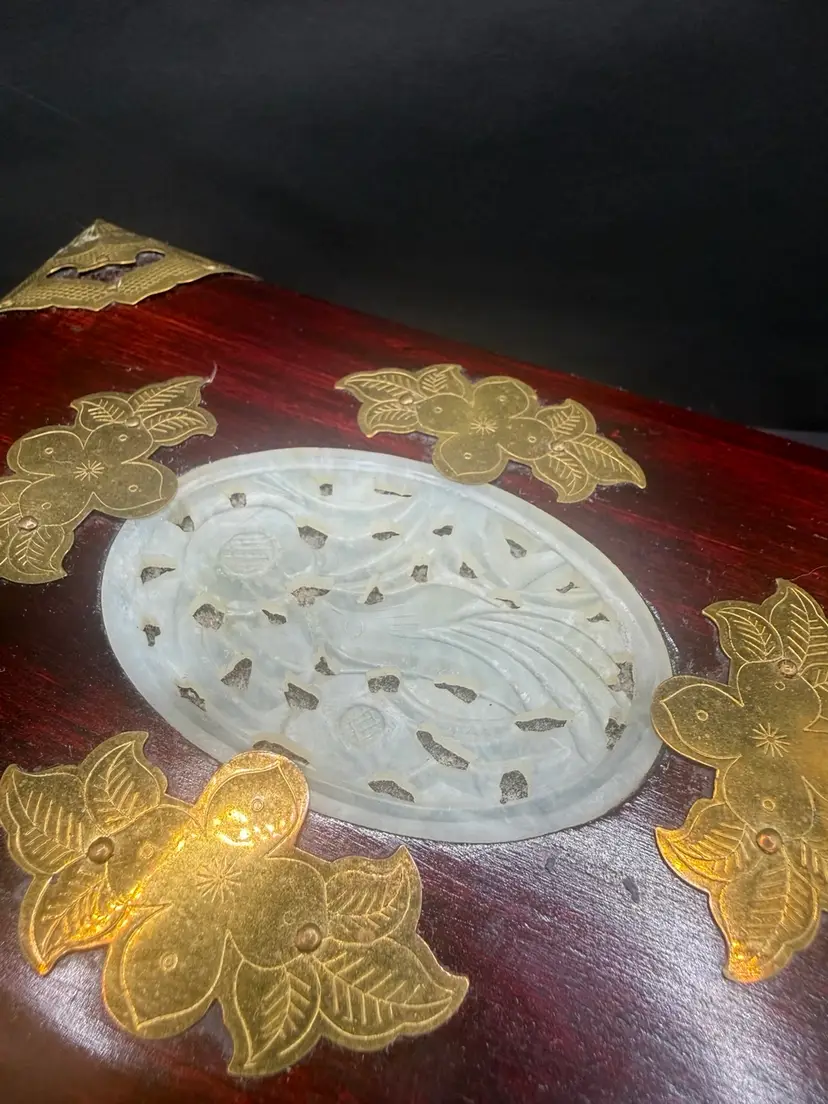 vintage Chinese jewelry box is constructed from rosewood and features a centrally inlaid carved white jade medallion on the lid, along with ornate brass accents.