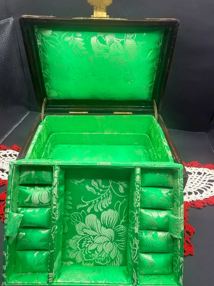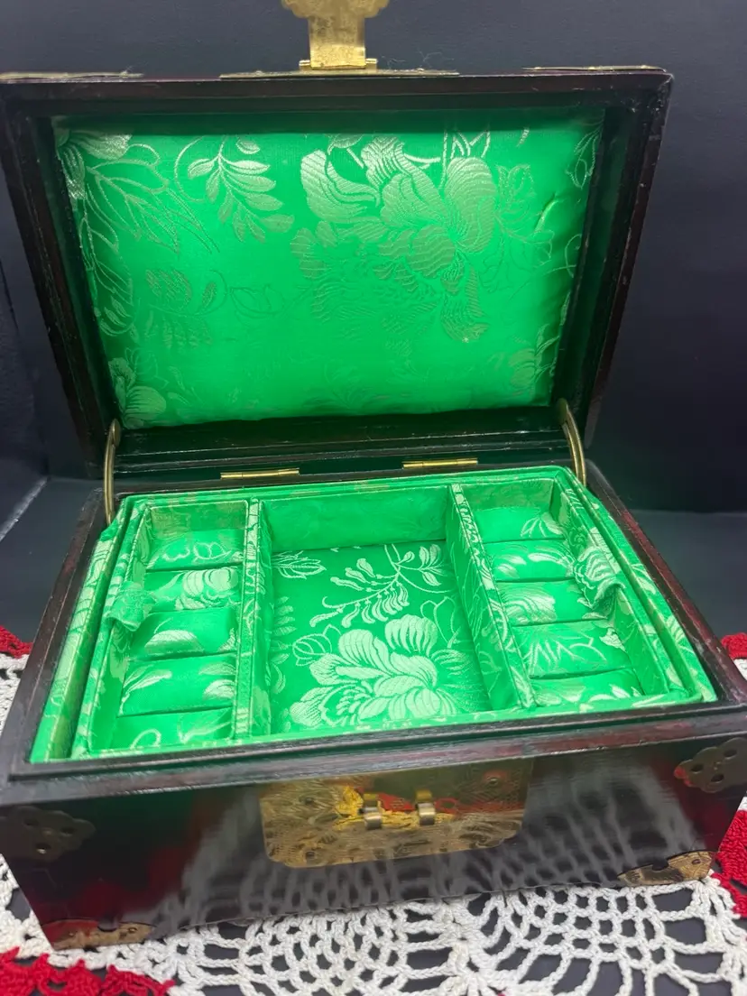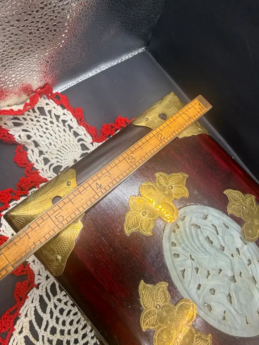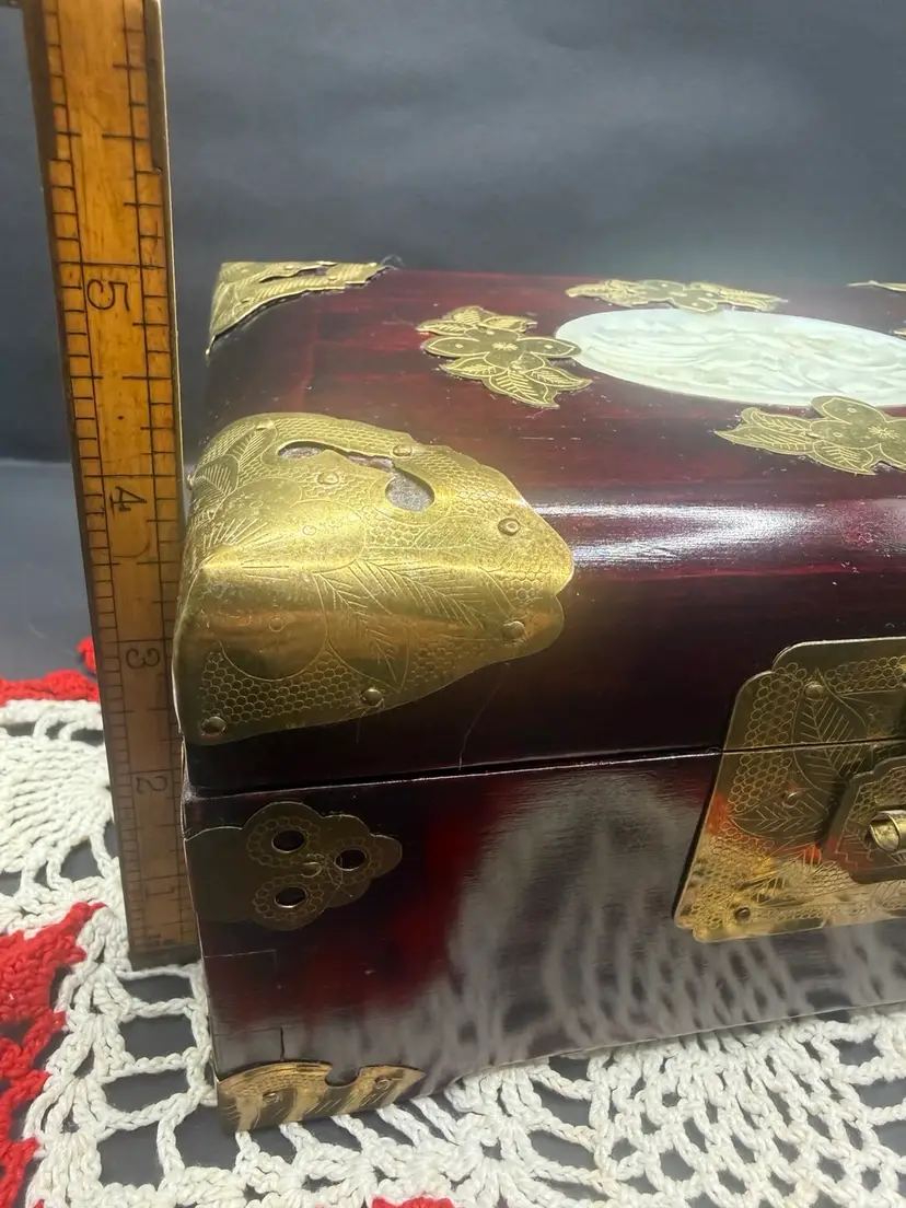 vintage Chinese jewelry box is constructed from rosewood and features a centrally inlaid carved white jade medallion on the lid, along with ornate brass accents.