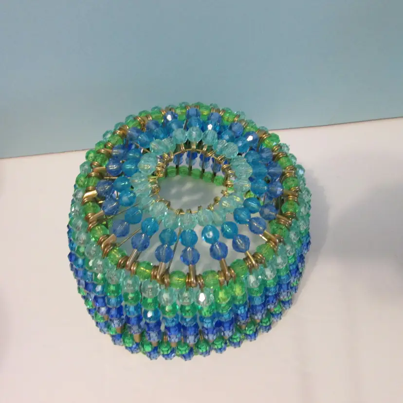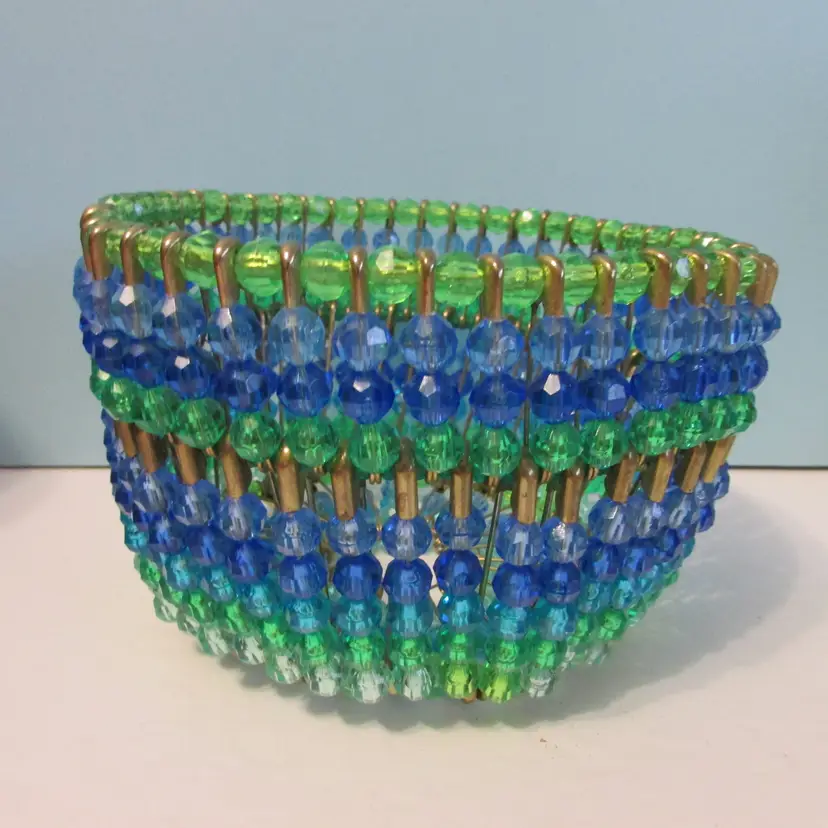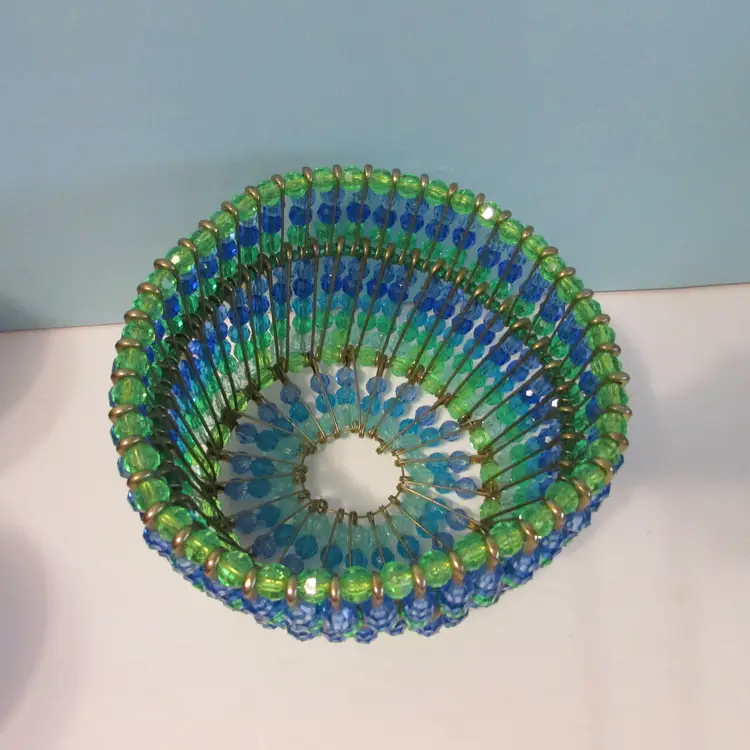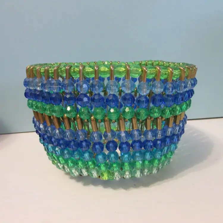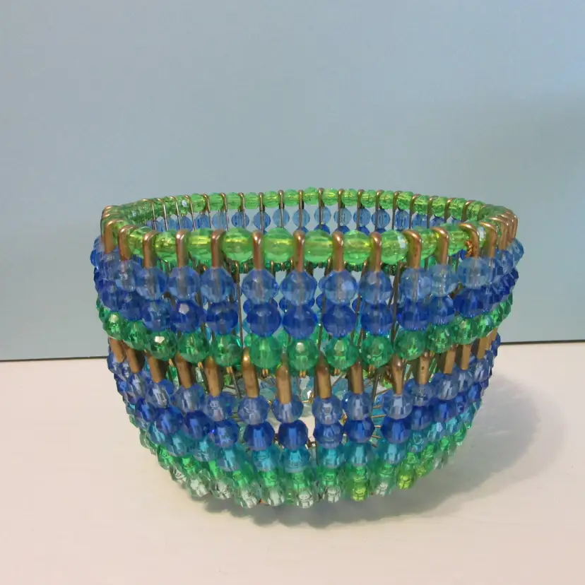 vintage crafted beaded safety pin art bowl basket holder green and blue holder