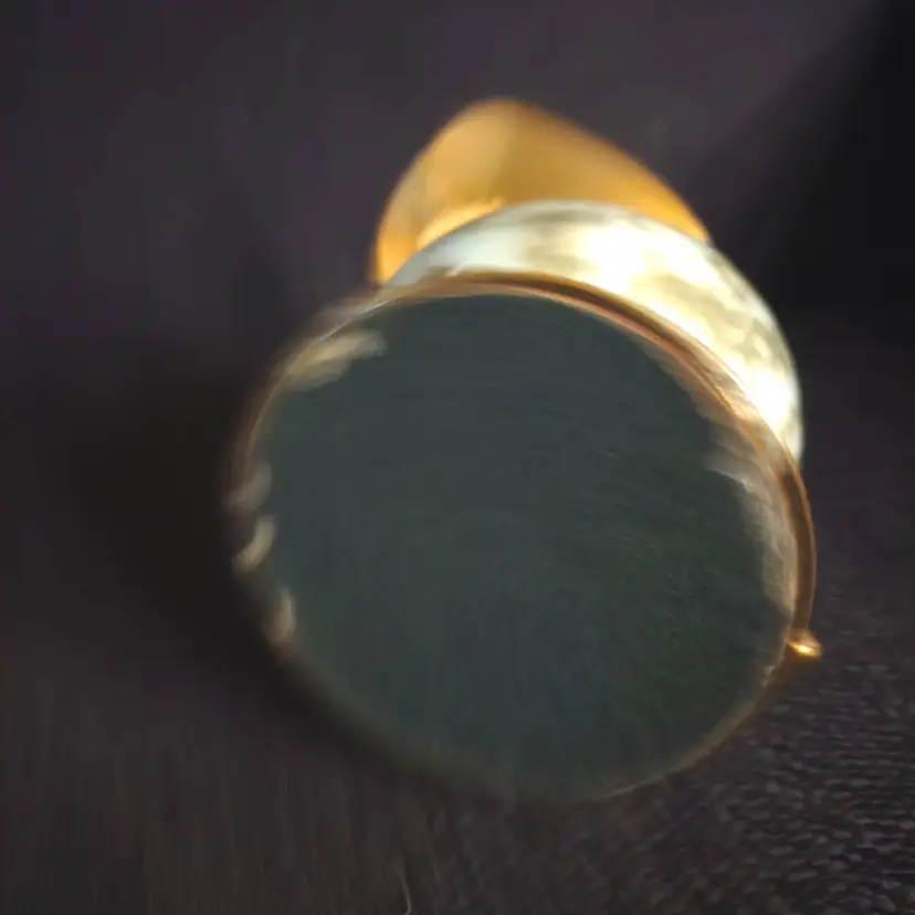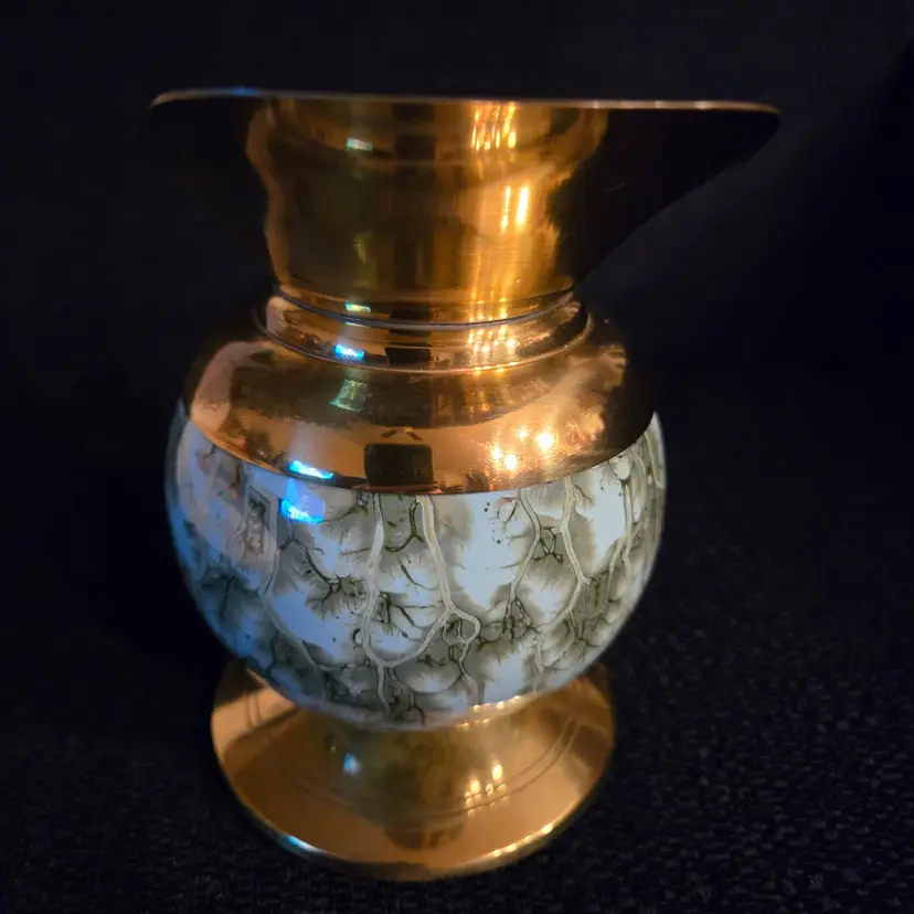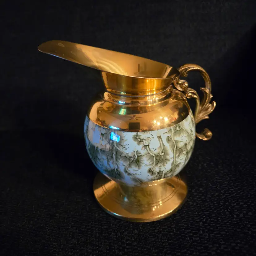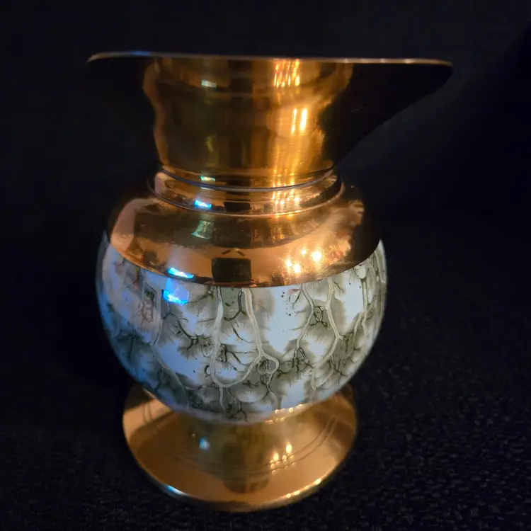 J Kruft delft vintage pitcher or vase. Solid brass and marbled pattern. The spout and base and handle are brass. The handle has a very unique design in beautiful brass. The center has a beautiful green marbling. Made in Dutch Holland. Approximately 6" 4" side to side, and 6: wide. In beautiful condition. No chips, cracks, dents, or repairs.