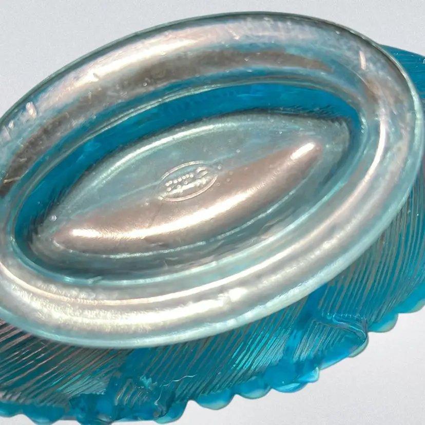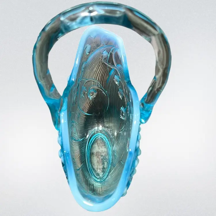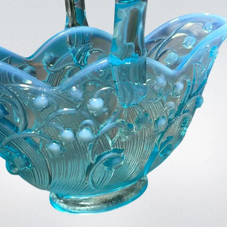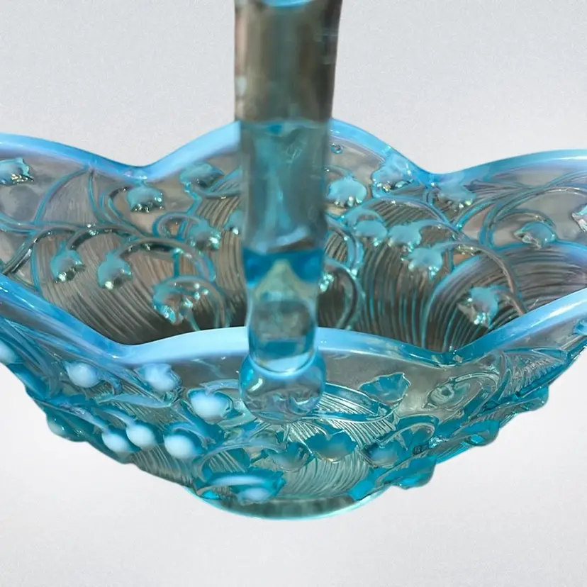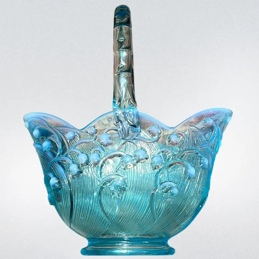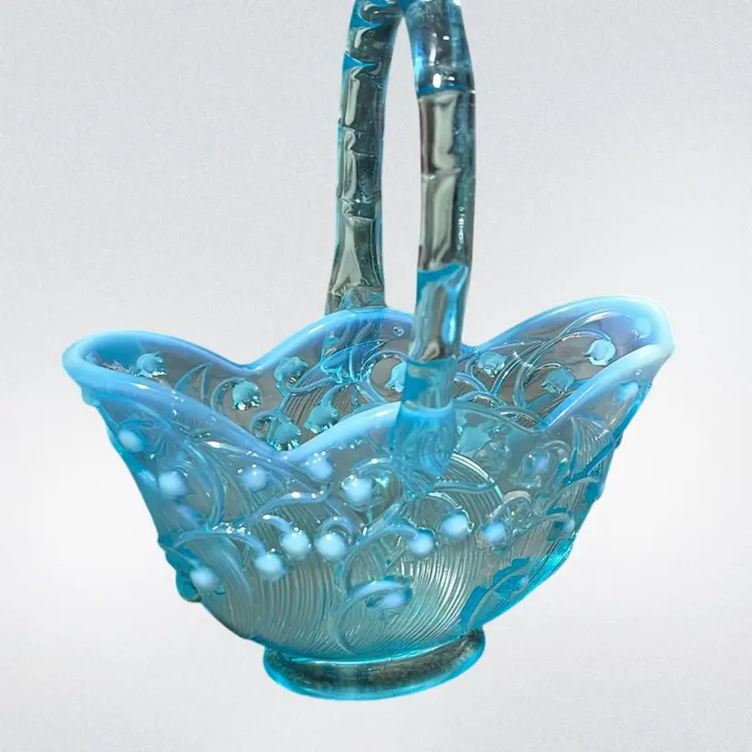 Vintage Fenton blue opalescent "Lily of the Valley" glass basket with Applied Glass bamboo Style handle. 1970’s, 6” Wide Stamped Bottom