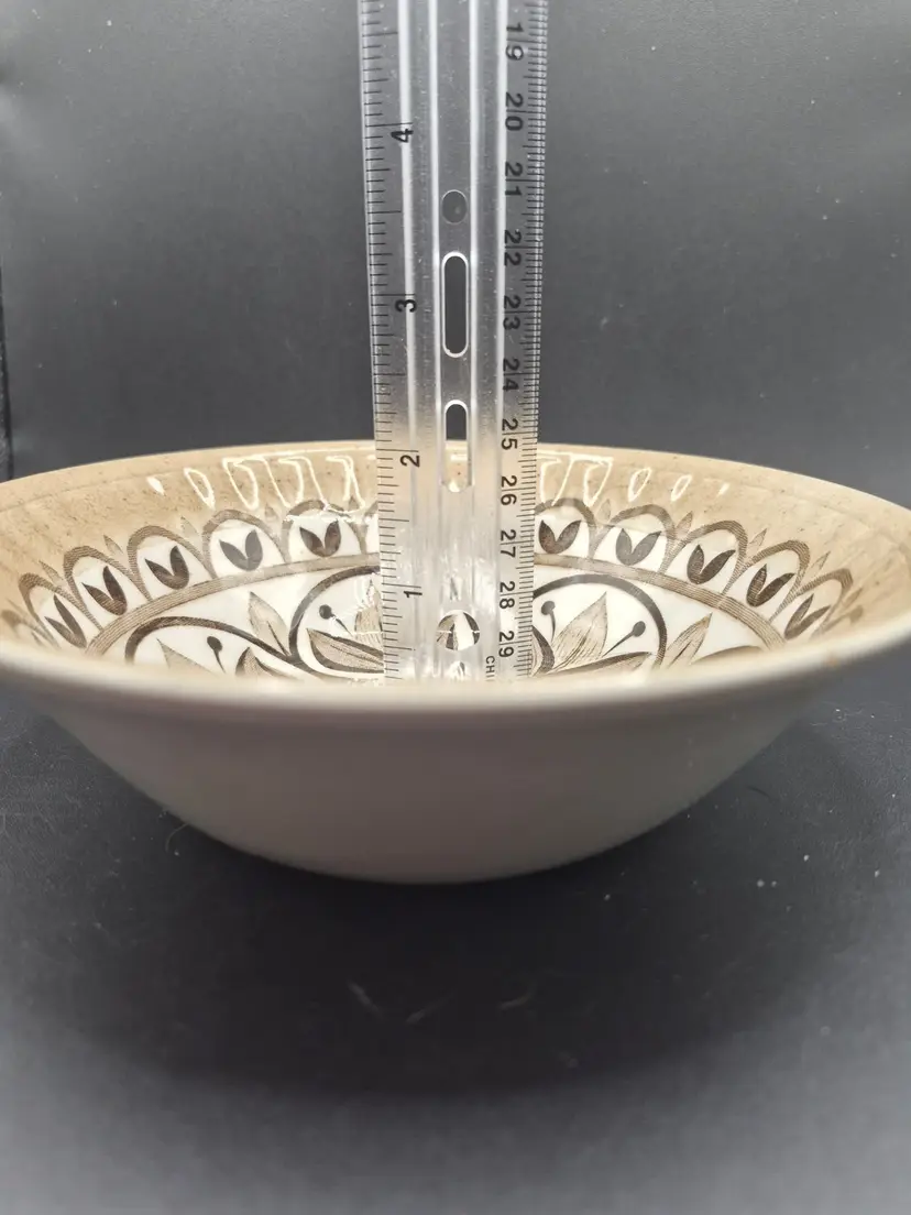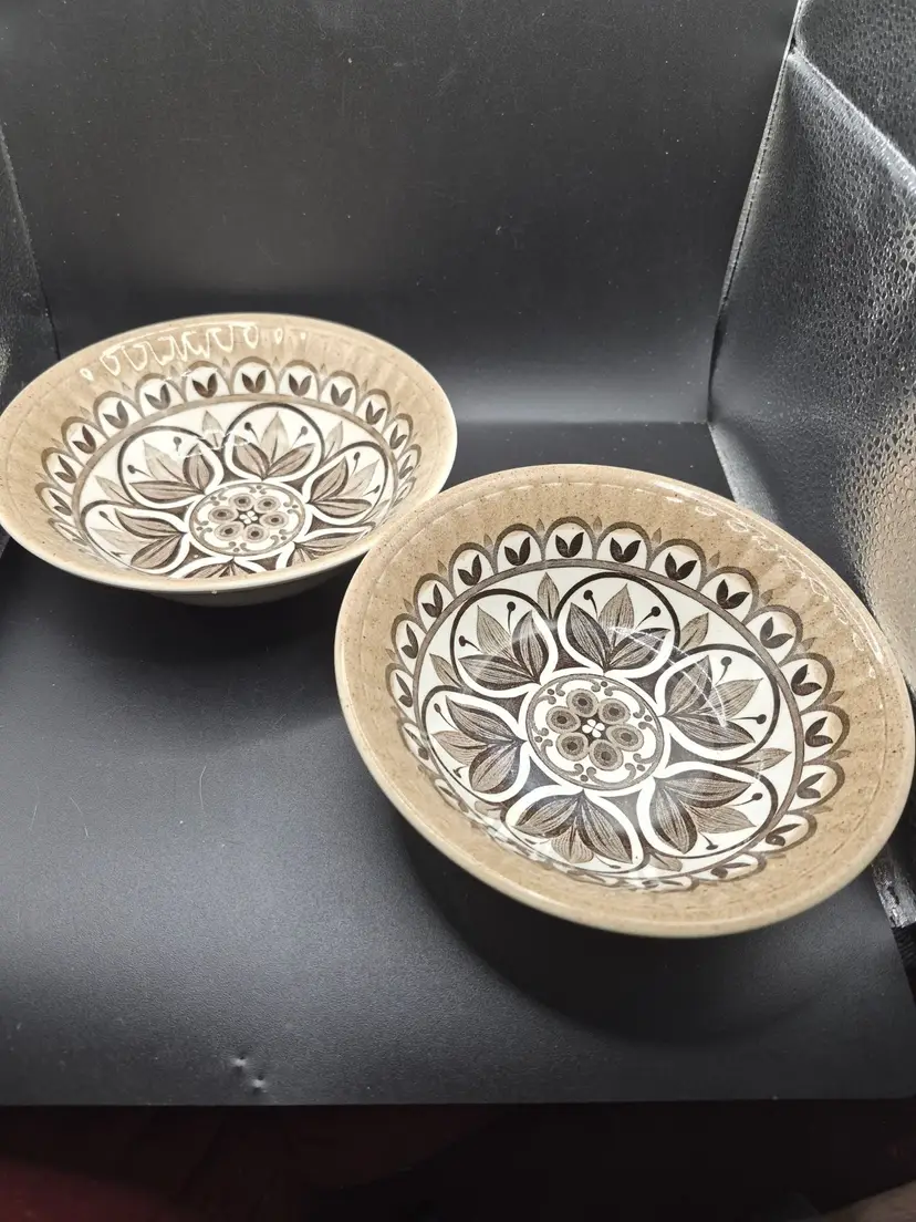 • Set of 2 bowls with floral hand-engraved design • Diameter: 6 inches, Height: 2 inches • Made of durable English ironstone • Dishwasher and detergent proof • Rustic brown and white finish