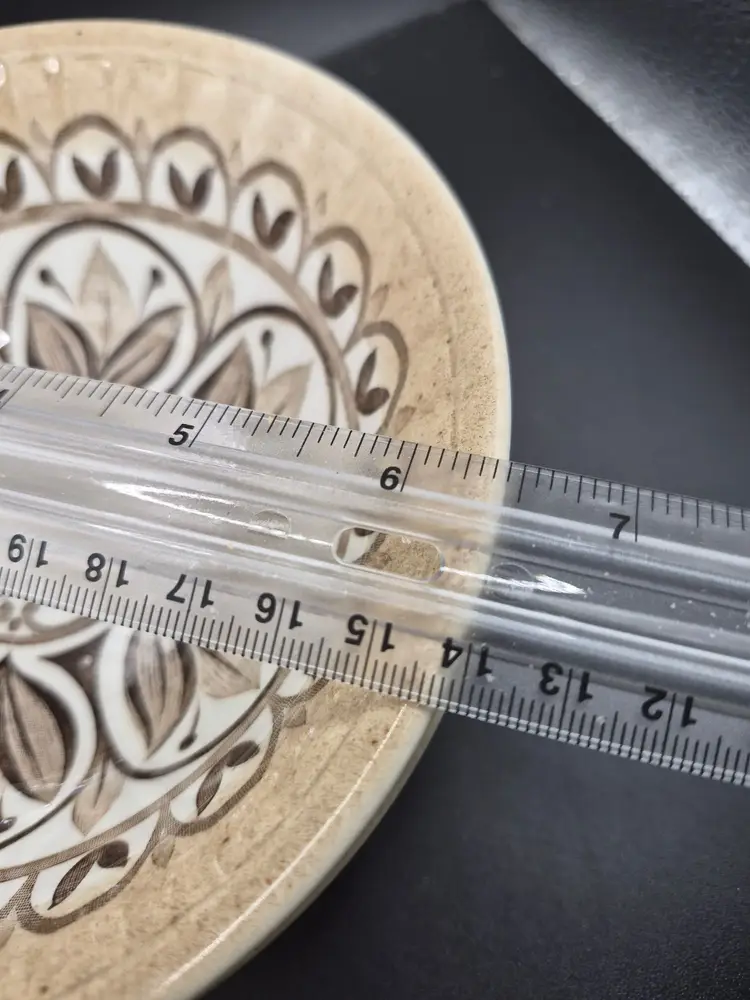 No visible cracks or chips noted. Slight wear on the base consistent with age. Diameter = 6 inches, Height = 2 inches