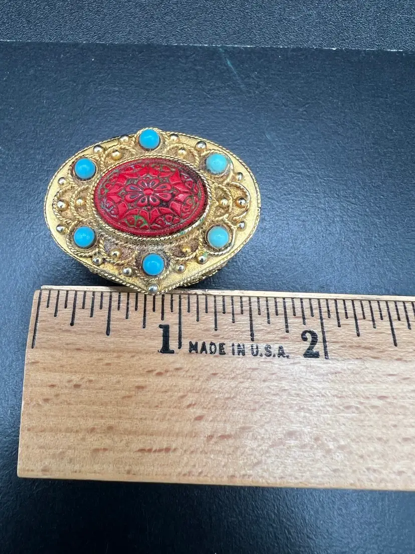 030. Vintage Florenza Pill Box w/ Large CARVED CINNABAR & FAUX TURQUOISE Beautiful!