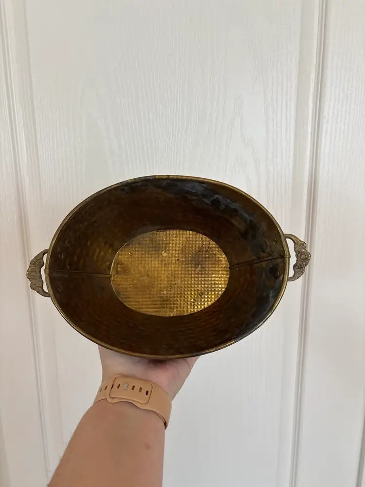 10”long including handles x 4”tall x 7”wide intage wear as shown- lots of patina