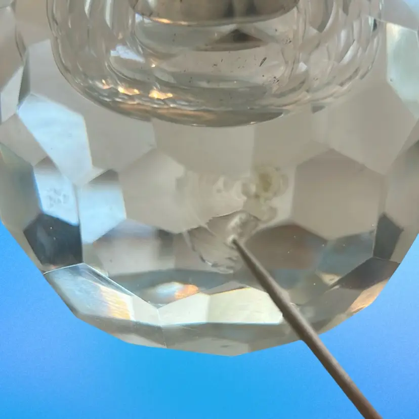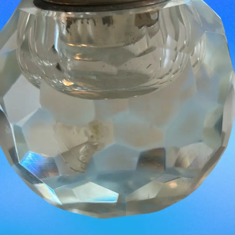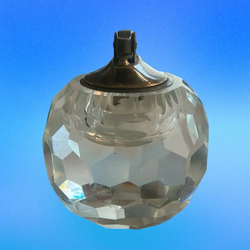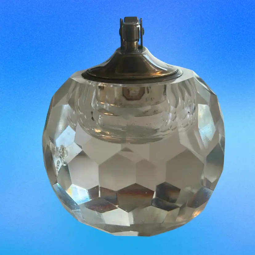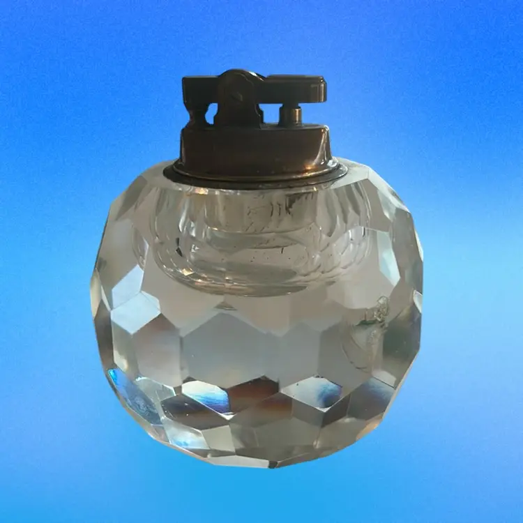 This item is a vintage faceted crystal table lighter, often produced during the Mid-Century Modern era by manufacturers like Princess House or Japanese makers. Features a heavy, clear, lead crystal or glass body, in an orb-shaped or faceted, designed to catch light. This is equipped with a brass hardware for fueling and sparking. There is some damage on this piece as shown in the last photo with the toothpick. It is a smooth, smooth flaw. It stands approximately 3 1/2 inches tall and it is approximately 3 1/2 inches wide. Intended as a decorative functional item for tables, popular in the 1960s and 1970s (SBA10)