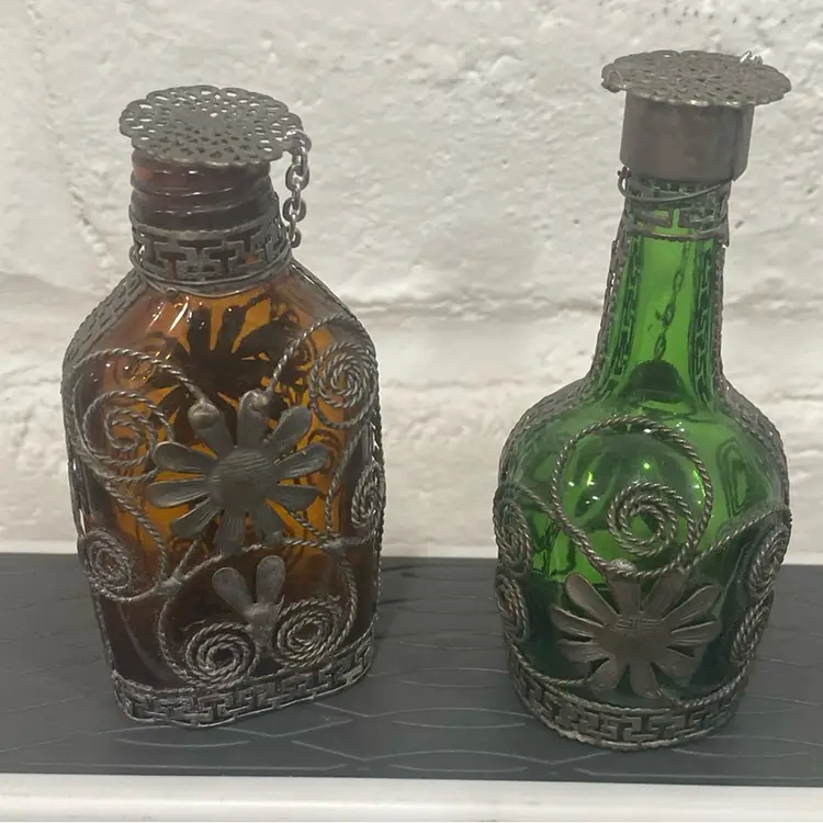 Vintage Lot green glass And Amber metal filigree, twisted wire, daisy, meanders,Greek keys,shabby chic, distressed, perfume, unique, bottle, emerald And Amber