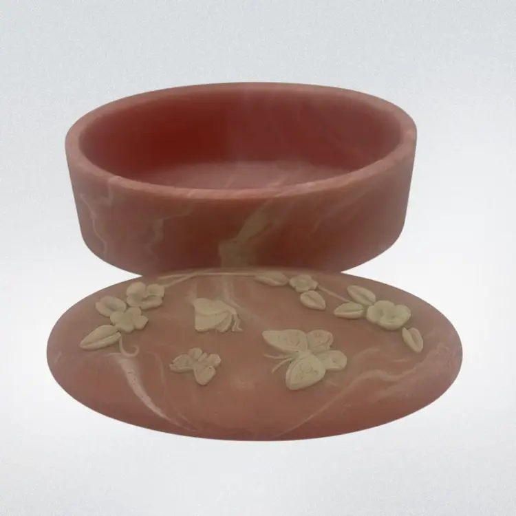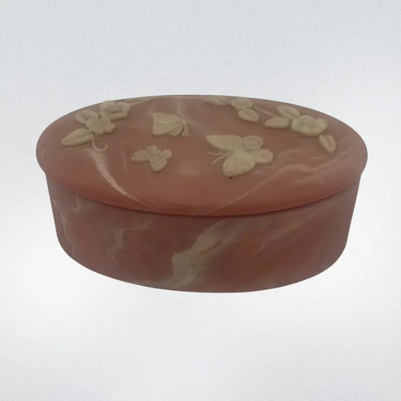 Featuring a white raised butterfly and flower motif on the lid. The box is oval shaped and in mint condition!