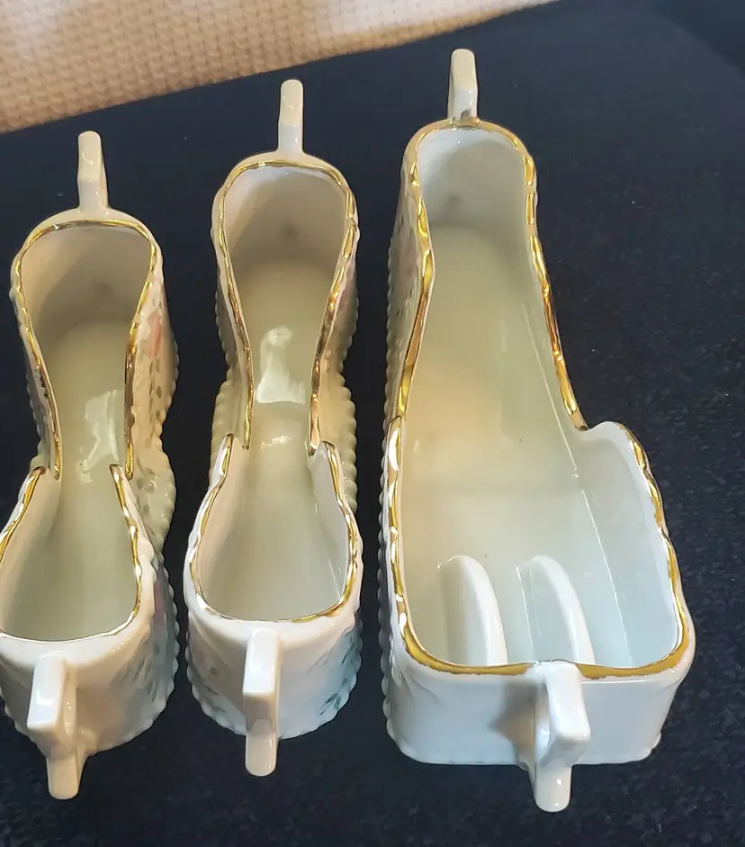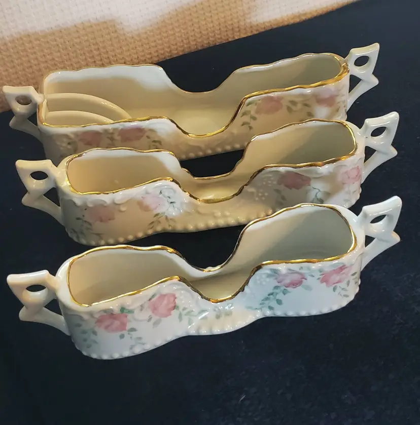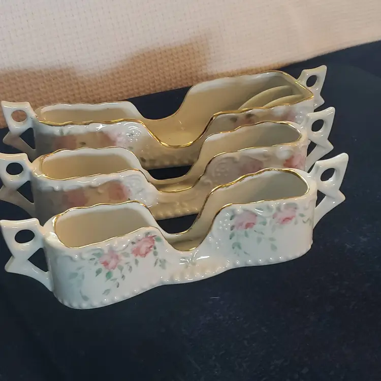 Designed to hold flatware or seving utensils. They features pretty pink roses with green leaves and gold gilt trim on a beautiful white Porcelain. Double holder measures 11 1/2" long, 2 1/2" tall, 3 1/8" wide at largest end. And 2 1/4" at narrow end. Medium holder measures 10 1/5" long, 2 1/2: tall and 2 "on both ends. Smallest holder measures 2 1/2" tall, 2" at widest part, and is 9 1/8" long. They are in excellent condition. They do show some wear on the gold gilt around the top edges. No chips, cracks, or repairs. No markings or stickers.
