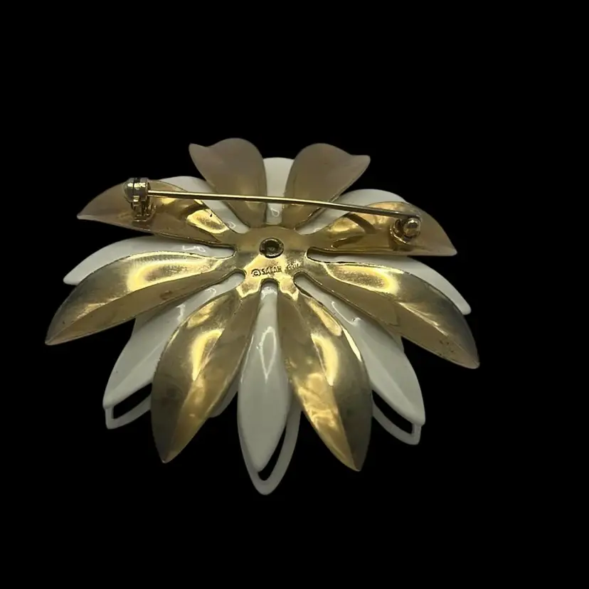 Featuring white enamel and gold toned metal petals. Signed from the 1966 collection.