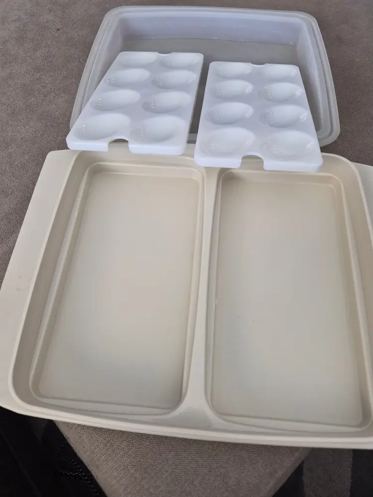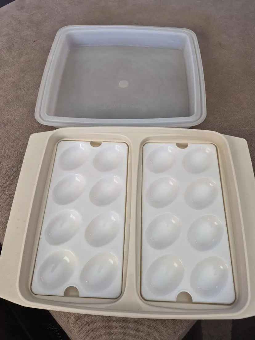 • Vintage Tupperware design • Two-piece egg storage system • Holds 12 eggs securely • Includes tight-fitting lid • Made in USA • Pristine white color