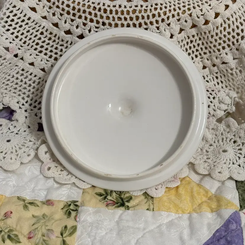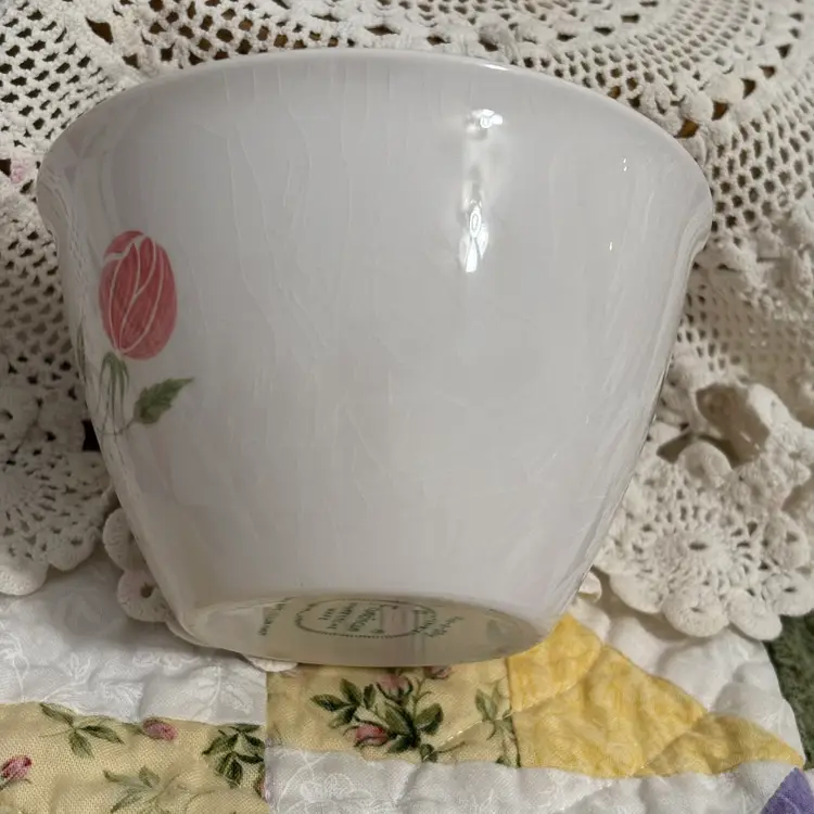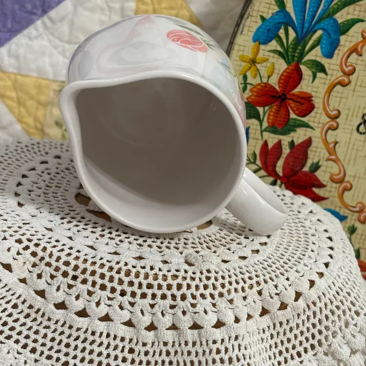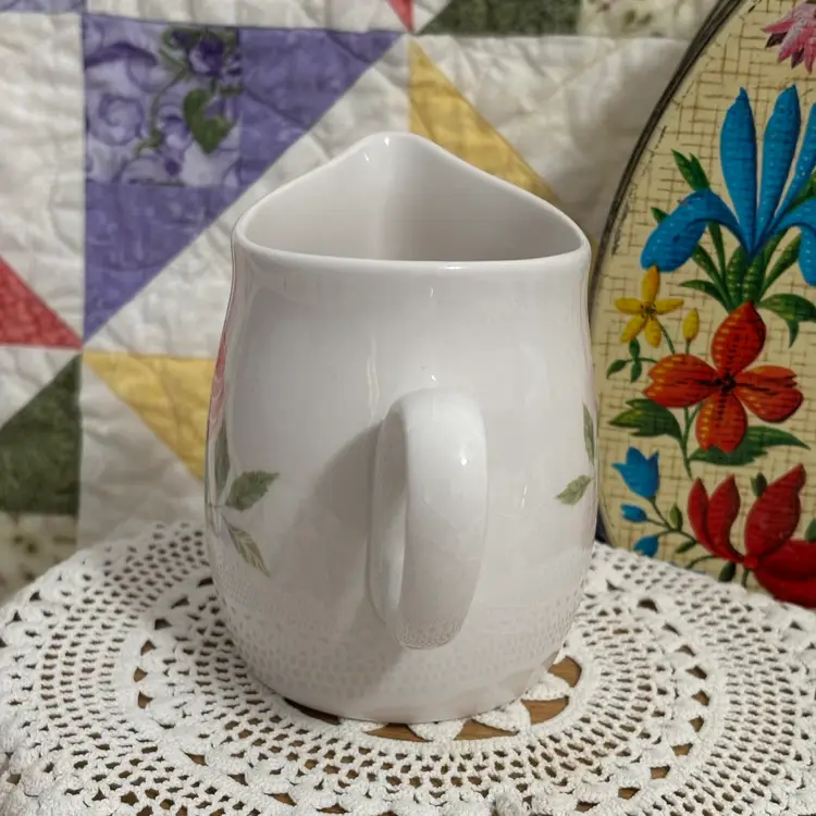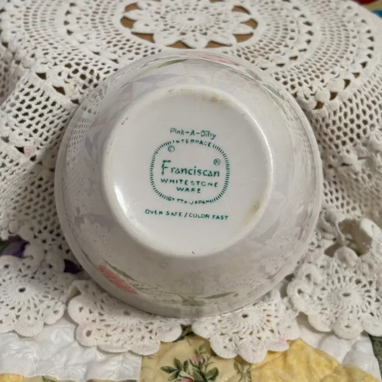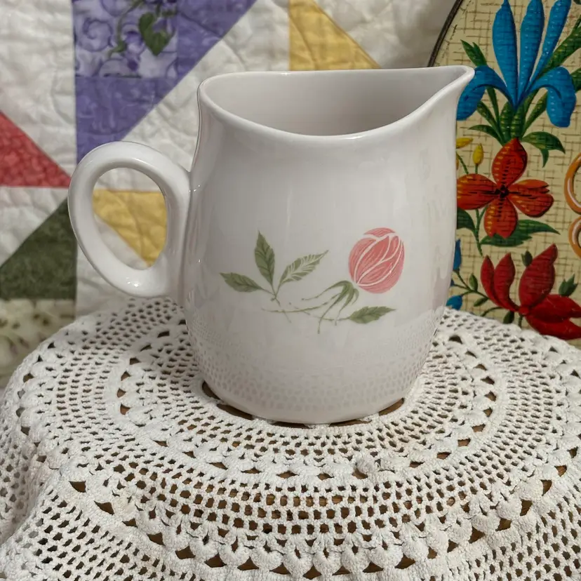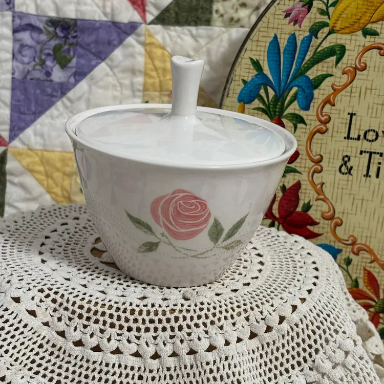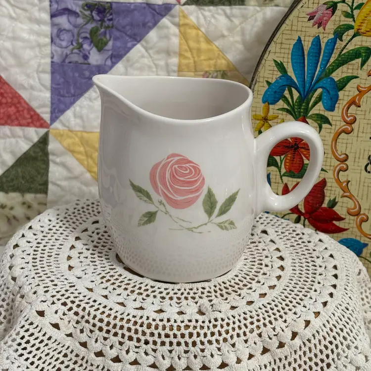 Featuring pink roses and green leaves. Was produced by Franciscan for only one year-1959. Glossy finish, produced in Japan. Pitcher stands 4" tall and holds 8-10 oz. Sugar bowl stands 4" wide by 4" tall. Sugar bowl has a bit of blemish from age. No chips, cracks or crazing. No color loss.