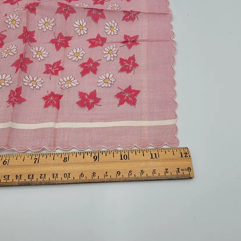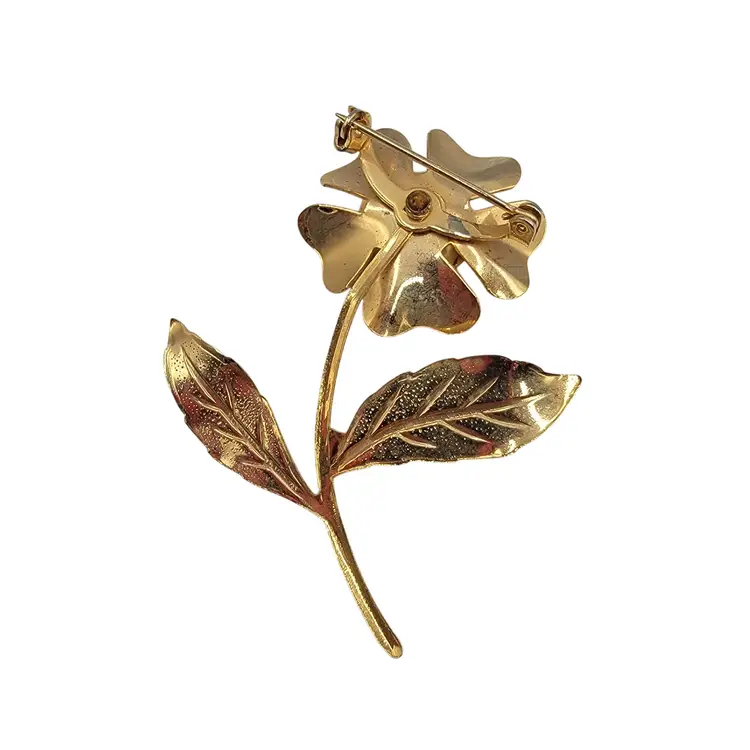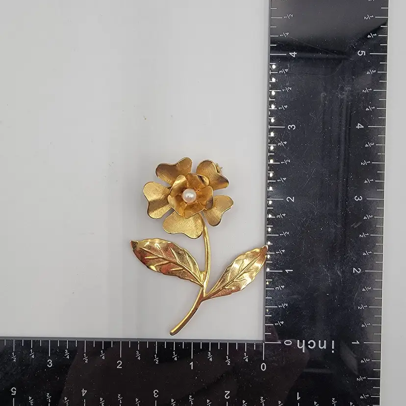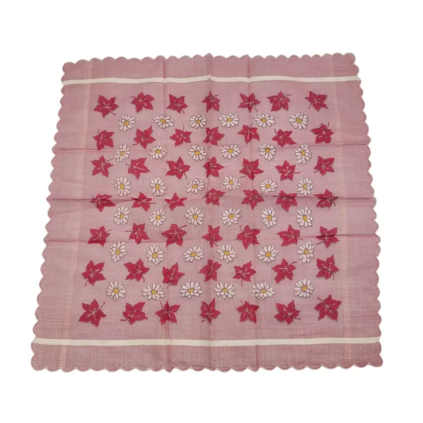 This vintage set evokes charm, blending the elegance of a gold-tone floral brooch adorned with a pearl and a soft pink handkerchief with vibrant floral embroidery.
