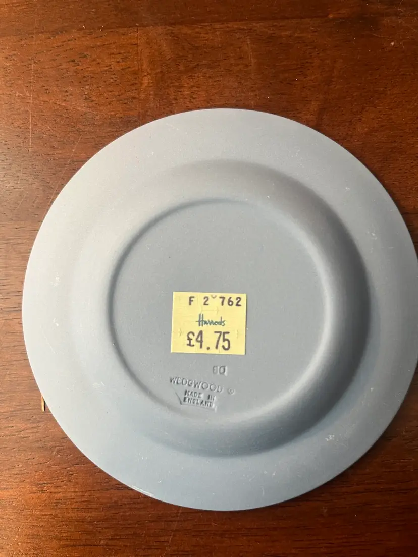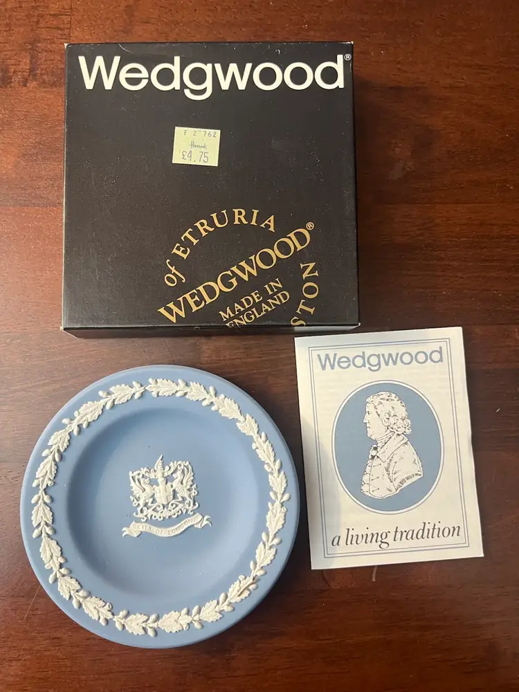 Wedgwood blue jasperware plate with City of London coat of arms. In Box 4.5”